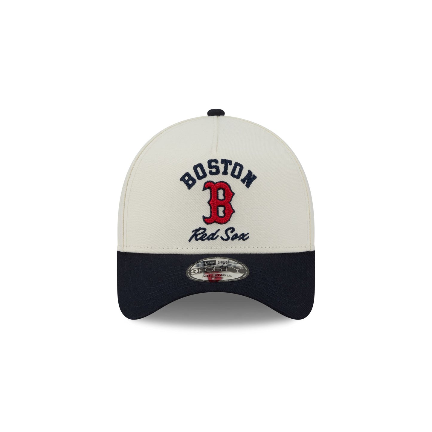 The Boston Red Sox Chrome White Arched 9FORTY A-Frame Snapback features an embroidered Red Sox arched logo graphic at the front panels with a team graphic at the right-wear side. Additional details include the establishment date above an adjustable snapback closure at the rear and a gray undervisor.