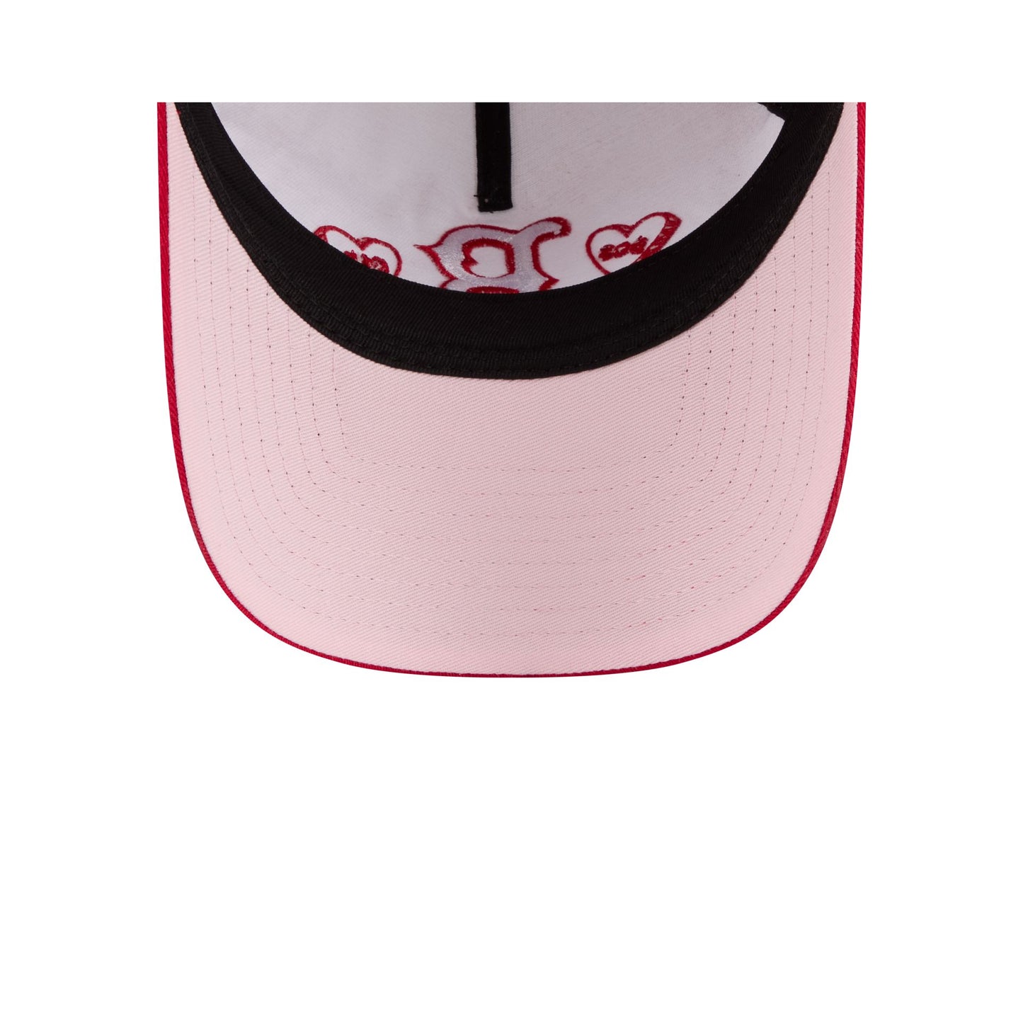 The Boston Red Sox Conversation Hearts 9TWENTY A-Frame Adjustable Cap features an embroidered Red Sox logo with conversation hearts at the front panels. Additional details include an adjustable D-Ring closure at the rear and a pink undervisor.