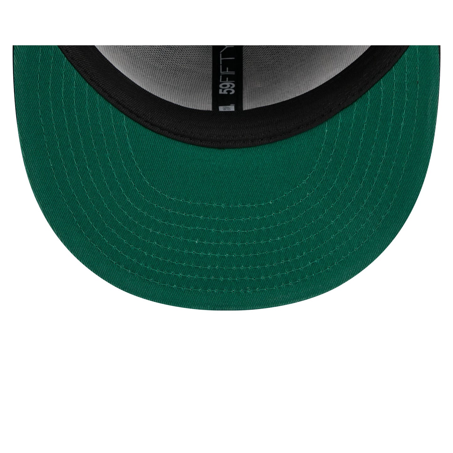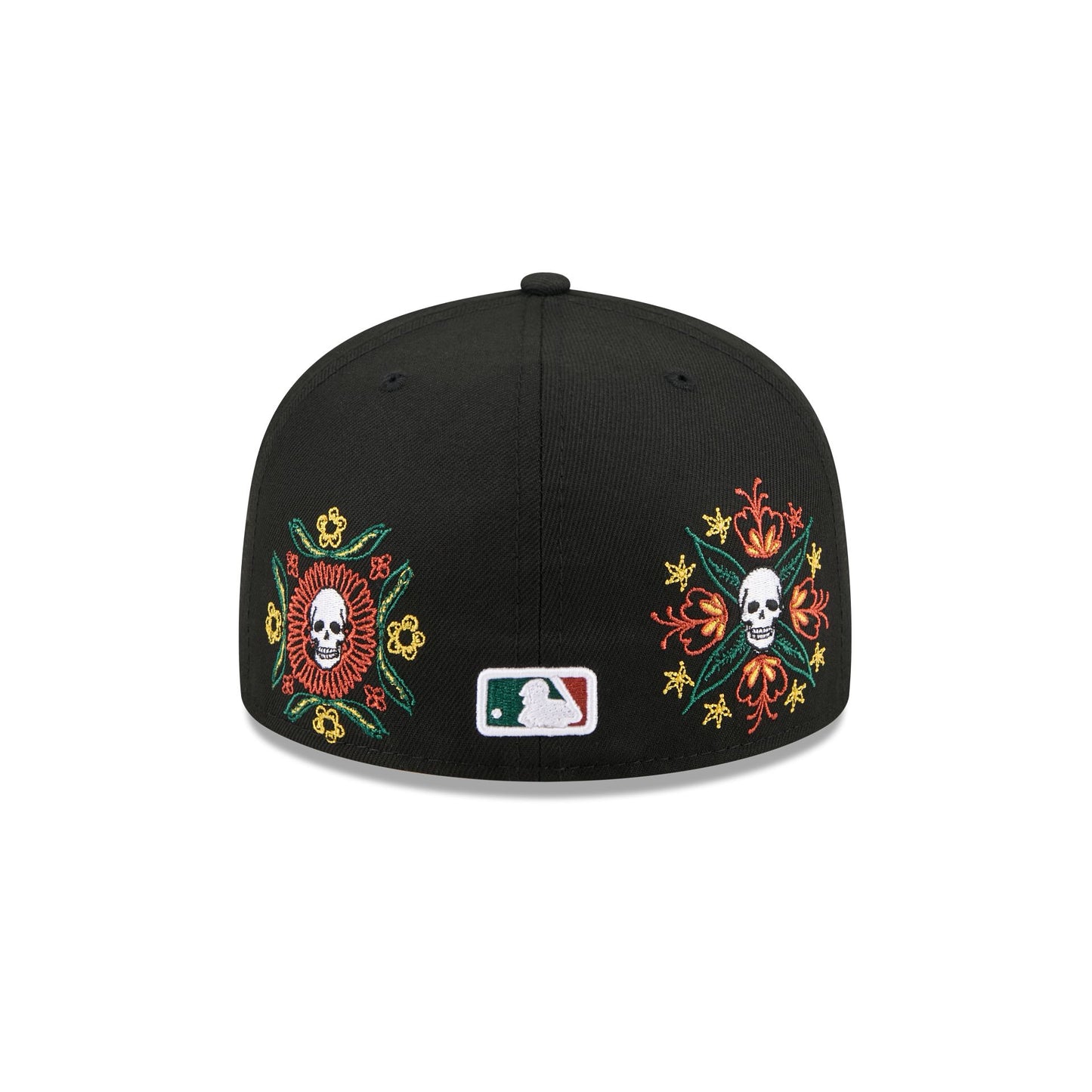 The Boston Red Sox Day of the Dead Skull & Flowers 59FIFTY Fitted Cap features an embroidered Red Sox logo at the front panels with Day of the Dead floral embroidery throughout the cap. Additional details include the MLB Batterman logo at the rear and a green undervisor.