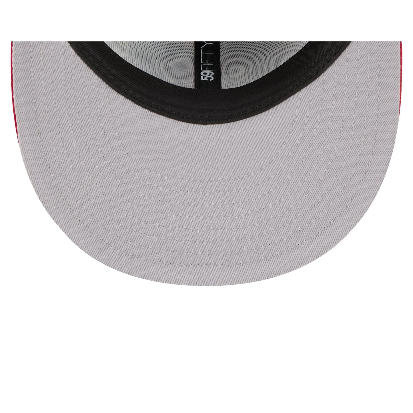 The Boston Red Sox Diamond Hero Edition 59FIFTY Fitted Cap features an embroidered Red Sox onomatopoeia pop logo at the front panels with baseball comic book prints at the front and back panel. Additional details include the MLB Batterman logo at the rear and a gray undervisor.