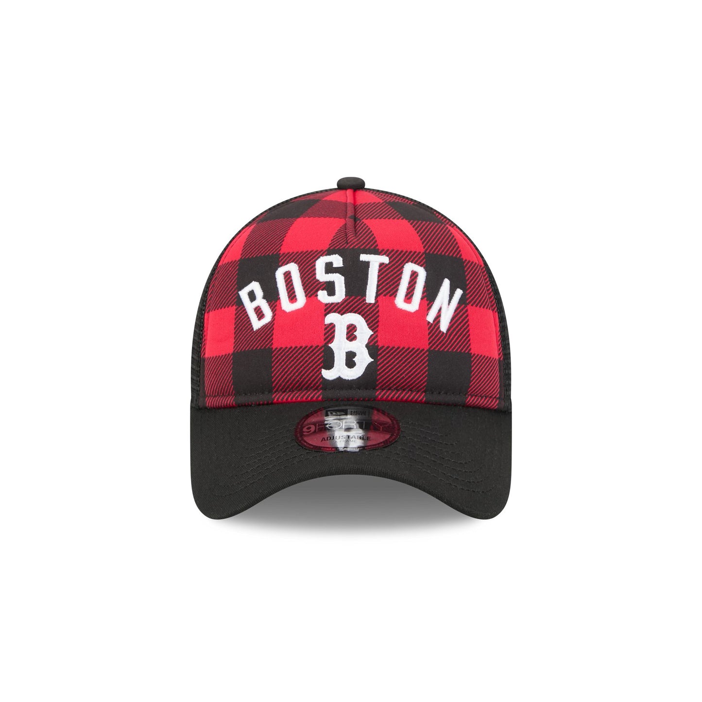 The Boston Red Sox Evergreen Check 9FORTY A-Frame Trucker features an embroidered Red Sox white wordmark and logo at a checkered plaid front panel. Additional details include an adjustable snapback closure at a mesh rear.