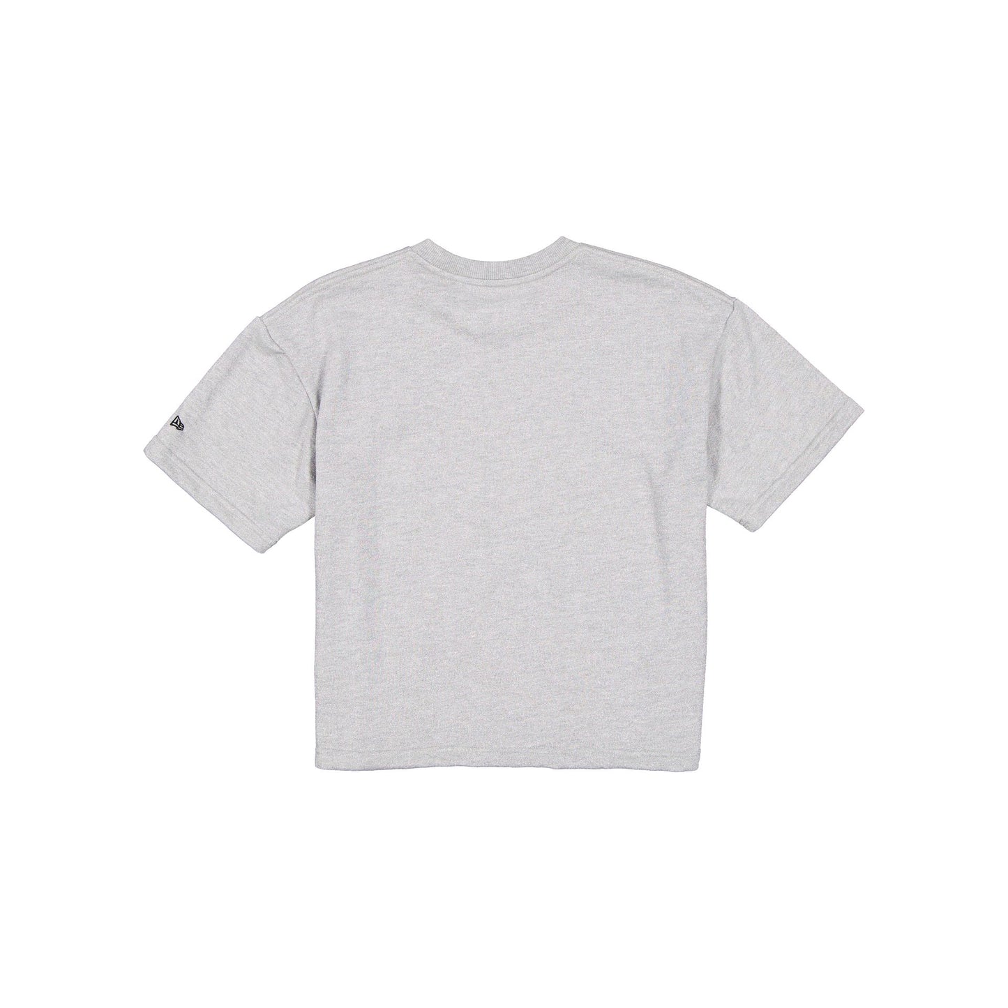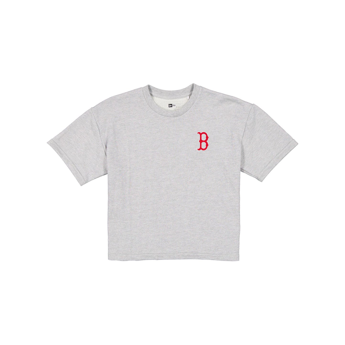 The Boston Red Sox Glam Game Women's Cropped Heather Gray T-Shirt features an embroidered Red Sox logo at the left chest with a cropped fit.