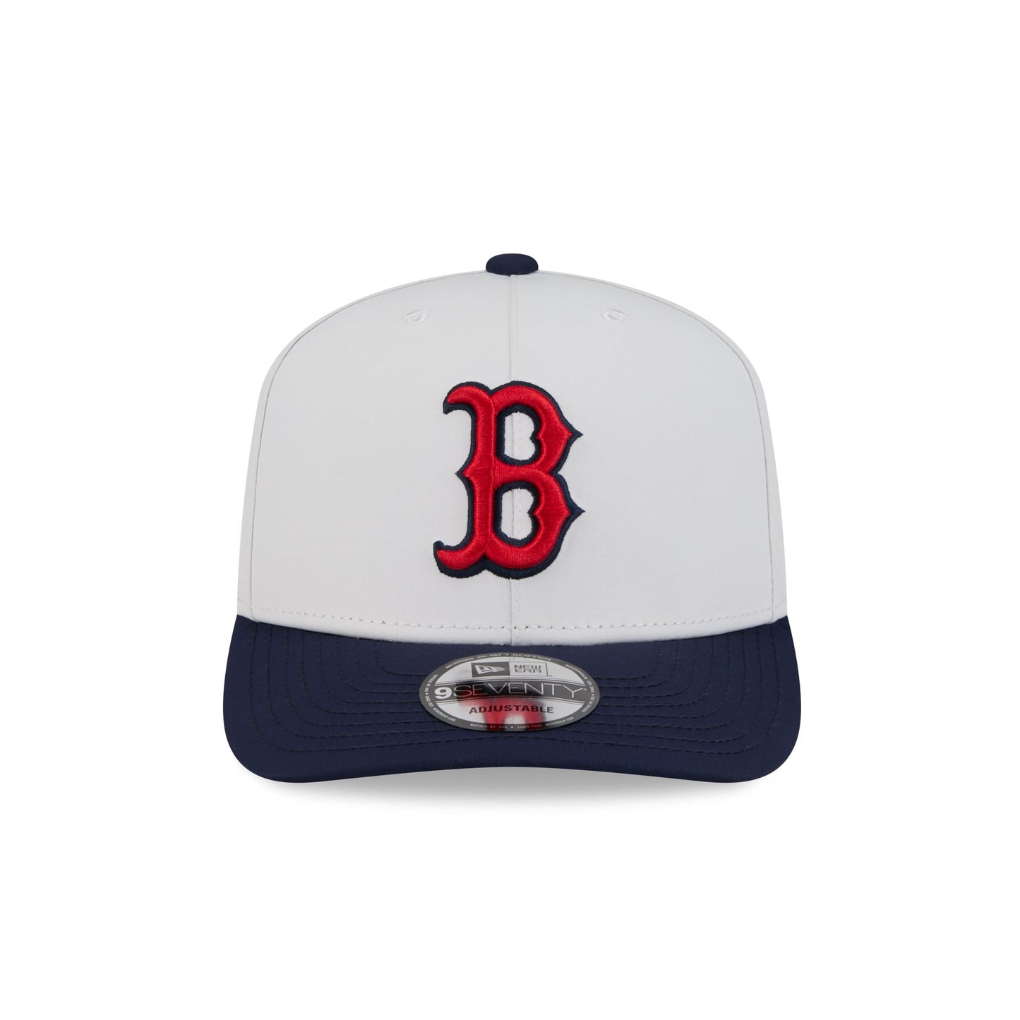 The Boston Red Sox GORE-TEX White 9SEVENTY Stretch-Snap features an embroidered Red Sox logo at the front panels with a metallic sheen silicone New Era Flag logo and GORE-TEX logo at the left-wear side. Additional details include an adjustable snapback closure at the rear, a gray undervisor, and a polyester fabrication throughout the cap. It is waterproof, breathable, and lightweight.