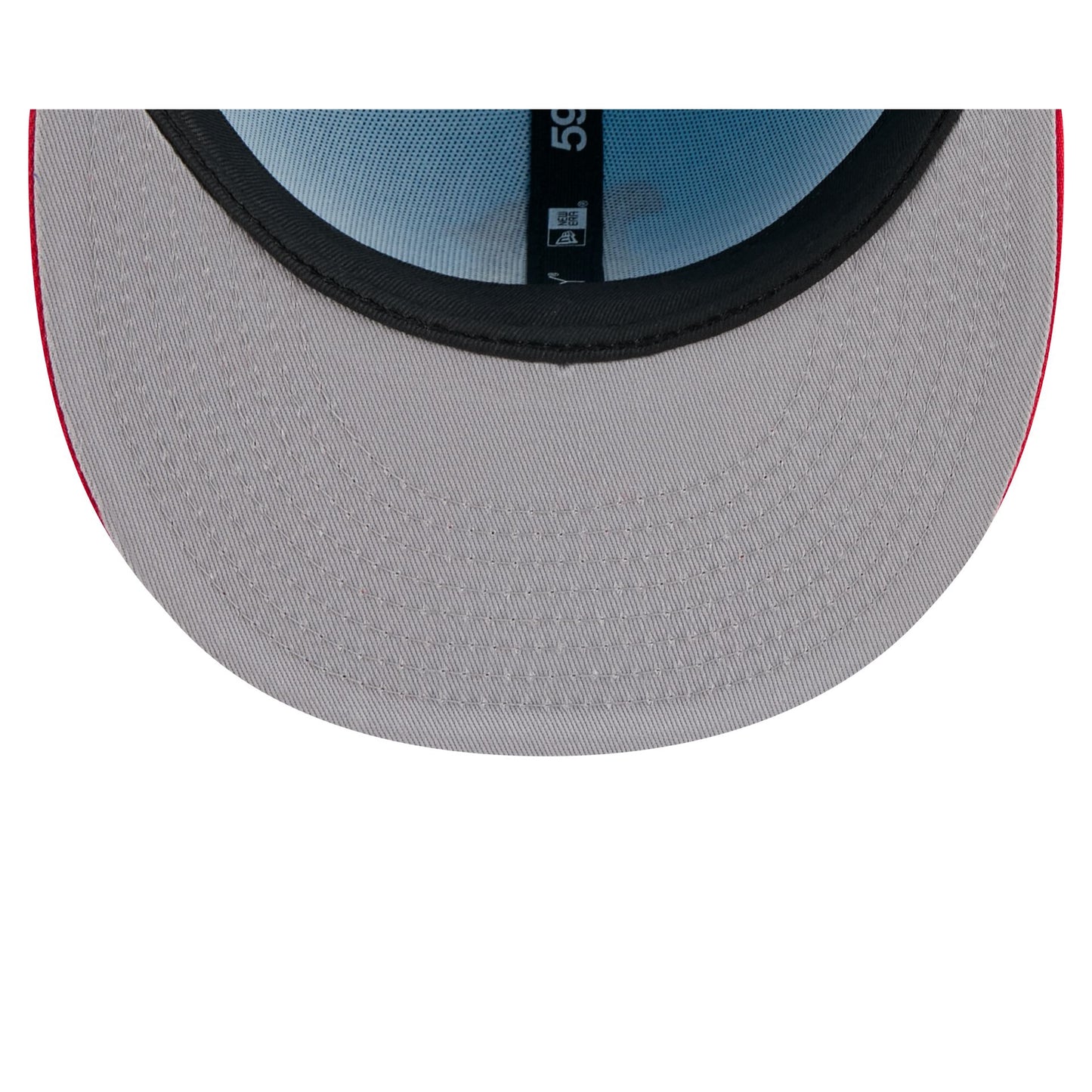 The Boston Red Sox Independence Day 2025 59FIFTY Fitted Cap features an embroidered American flag themed Red Sox logo at the front panels with a matching MLB Batterman logo at the rear, a red visor, and a gray undervisor.