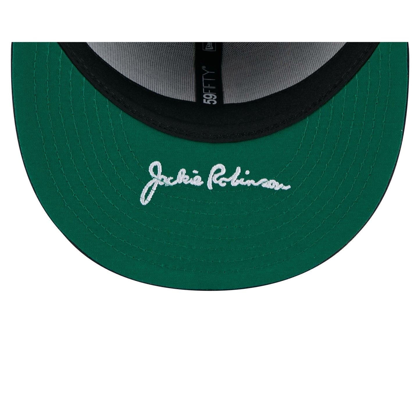 The Boston Red Sox Jackie Robinson Day 2025 59FIFTY Fitted Cap features an embroidered Red Sox logo at the front panels with an MLB Batterman logo at the rear. Additional details include a Jackie Robinson Breaking Barriers patch at the right-wear side and Robinson's embroidered signature on a green undervisor.