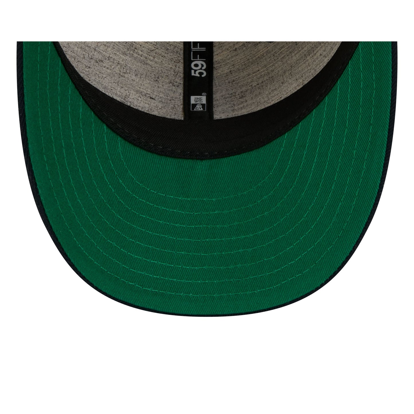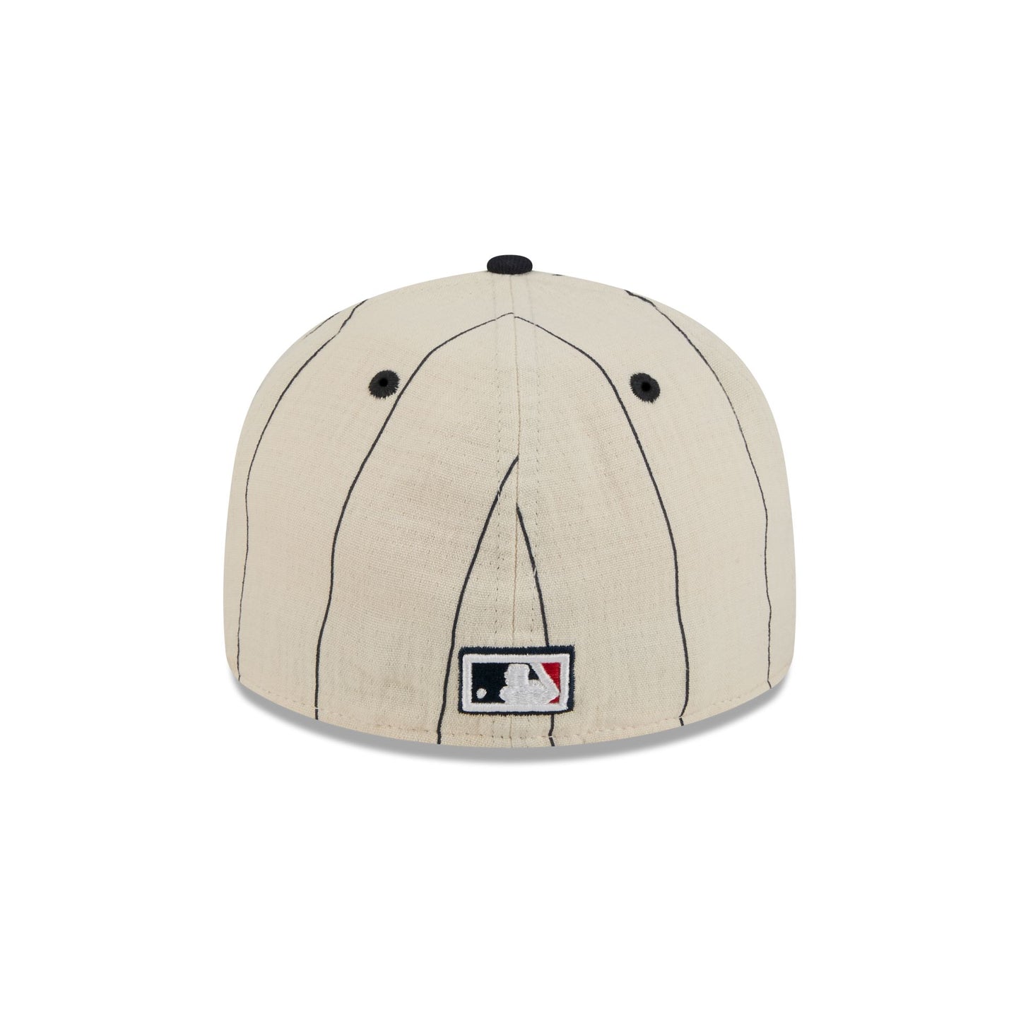 The Boston Red Sox Linen Pinstripe Retro Crown 59FIFTY Fitted Cap features an embroidered Red Sox Cooperstown logo at the front panels against a linen pinstripe fabrication throughout. Additional details include the MLB Batterman logo at the rear and a green undervisor.