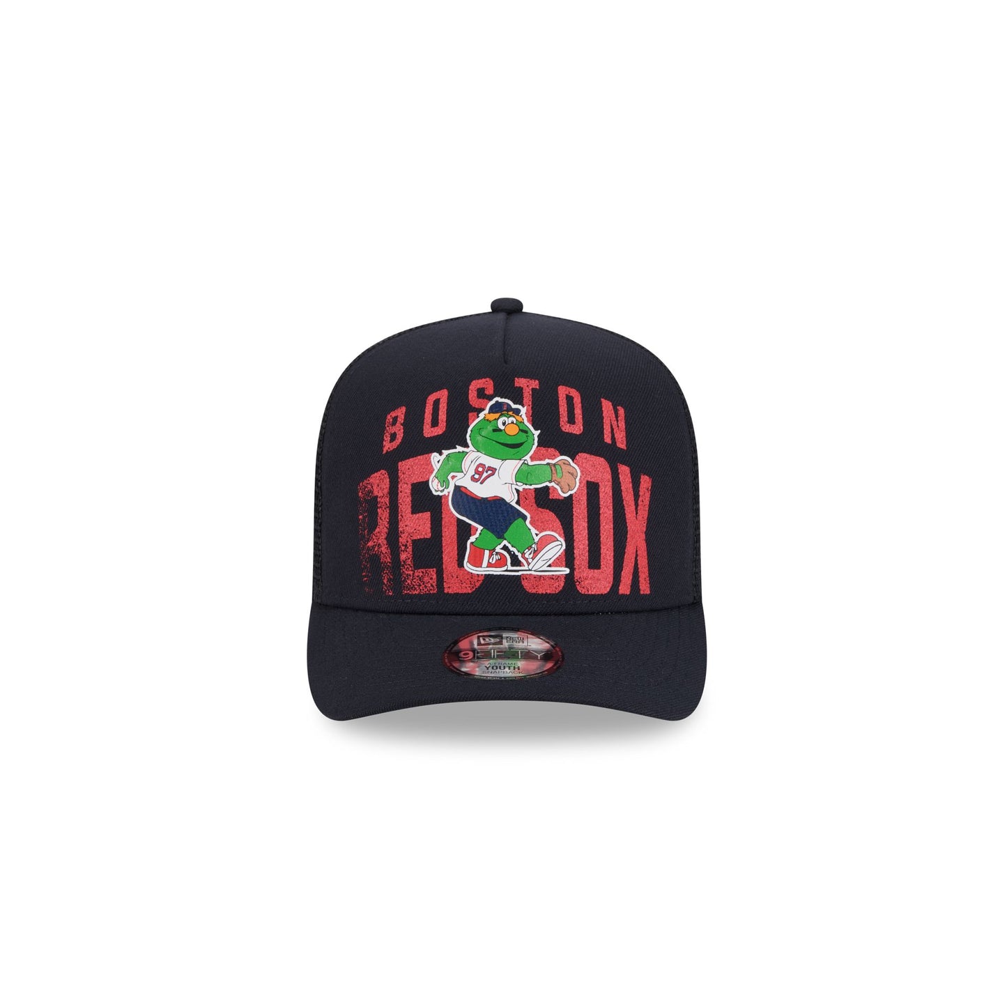 The Boston Red Sox Logo Fade Kids 9FIFTY A-Frame Trucker features a screen-printed Red Sox graphic at the front panels with an adjustable snapback closure at a mesh rear and a gray undervisor.