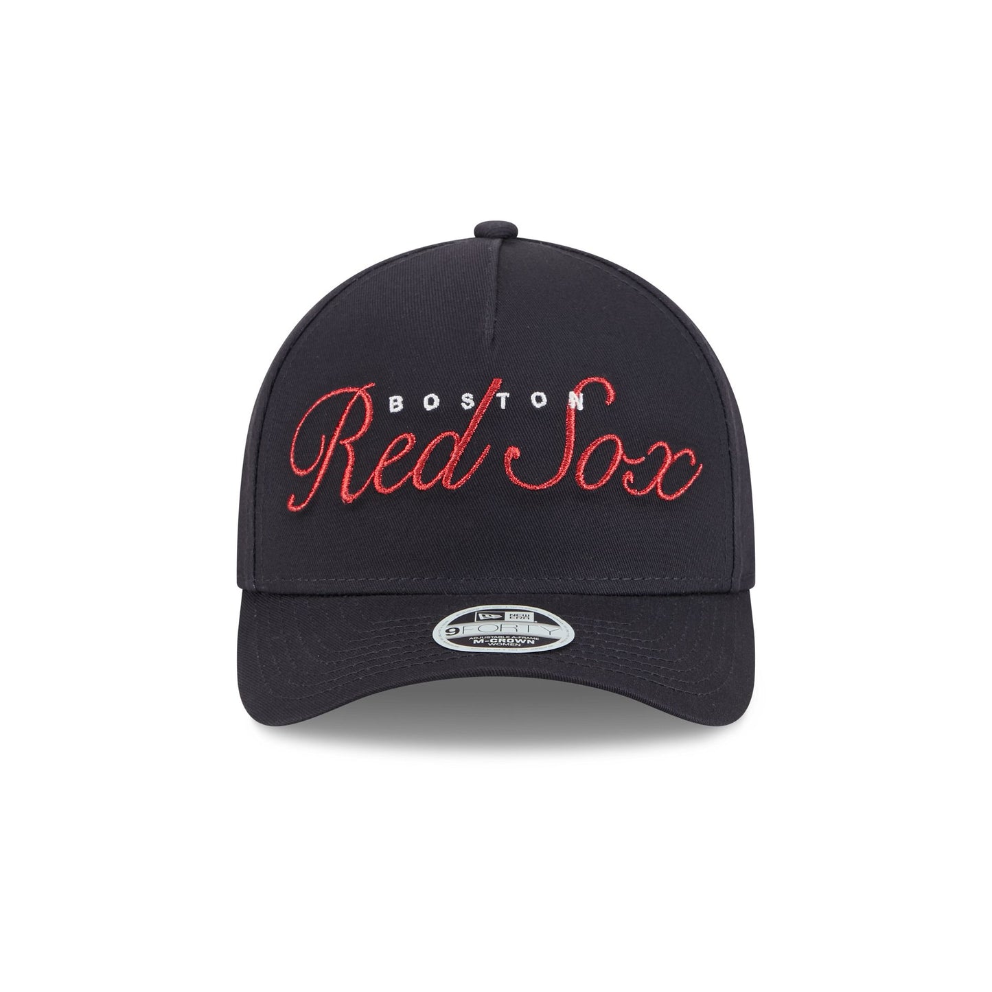 The Boston Red Sox Metallic Women's 9FORTY M-Crown A-Frame Snapback features an embroidered Red Sox metallic script wordmark at the front panel with a snapback closure at the rear and a satin undervisor.