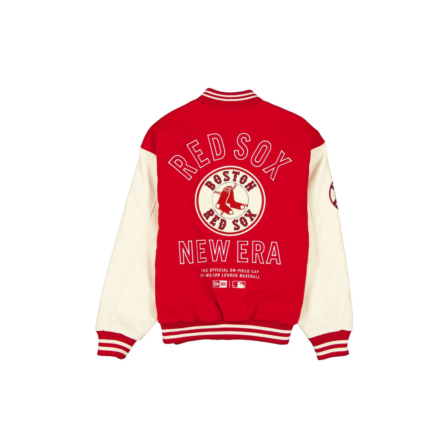 The Boston Red Sox Patched Red Varsity Jacket features a chenille applique Red Sox logo at the left chest, a snap-button closure at the front, and a team script at the side slit pockets. Additional details include a Red Sox logo patch at the right sleeve with a matching team wordmark and logo above New Era Cap wordmark and MLB Batterman logo at the rear. The jacket features striped details at the banding on the sleeves and hem with an interior pocket at the left chest and a quilted insolation lining.