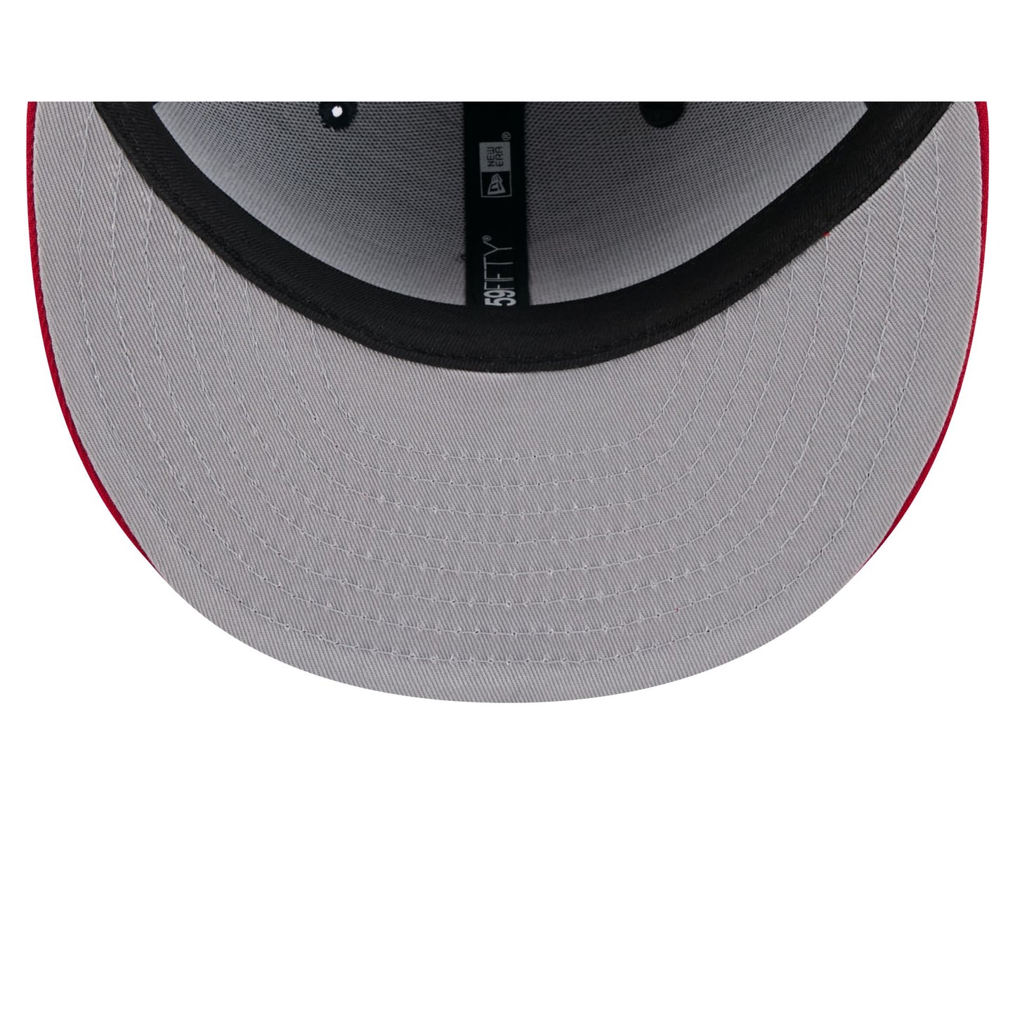 The Boston Red Sox Pinstripe League Pin 59FIFTY Fitted Cap features an embroidered Red Sox logo at the front panels with a League pin at the front right panel. Additional details include pinstripes, a matching MLB Batterman logo at the rear, and a gray undervisor.