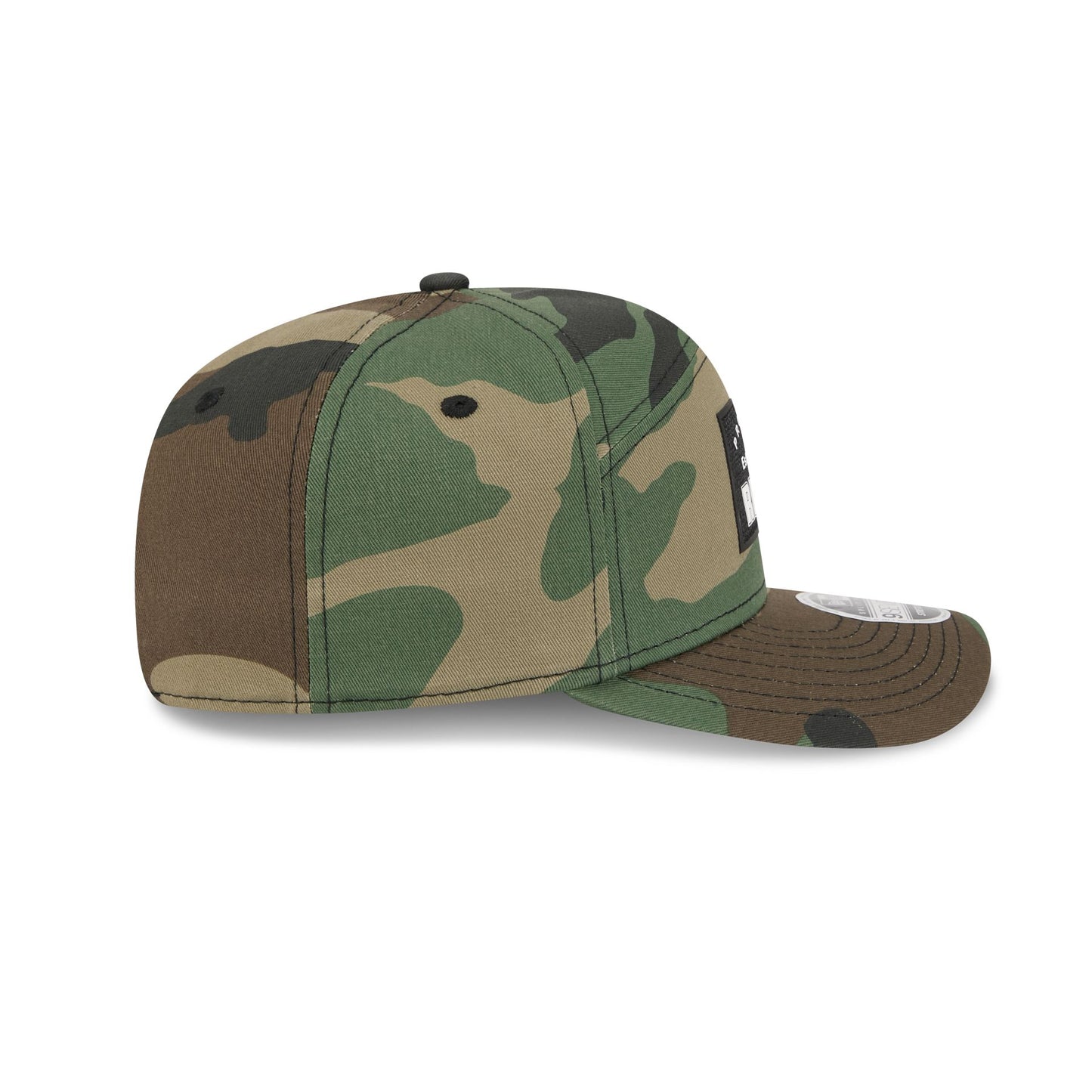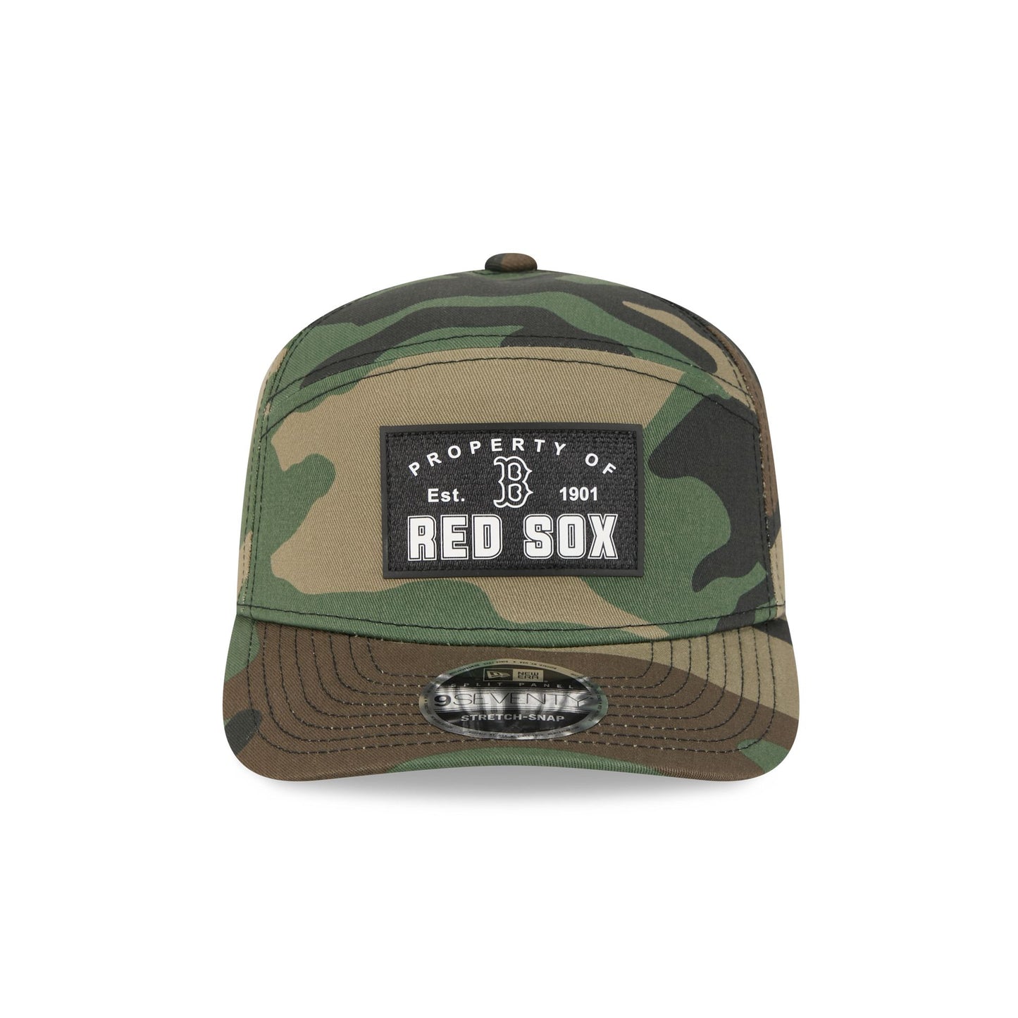 The Boston Red Sox Property of Patch Camo Split Panel 9SEVENTY Stretch-Snap features a woven "Property of" Red Sox patch a the front panels with a split crown construction. Additional details include an adjustable stretch-snap closure at the rear and a black undervisor.