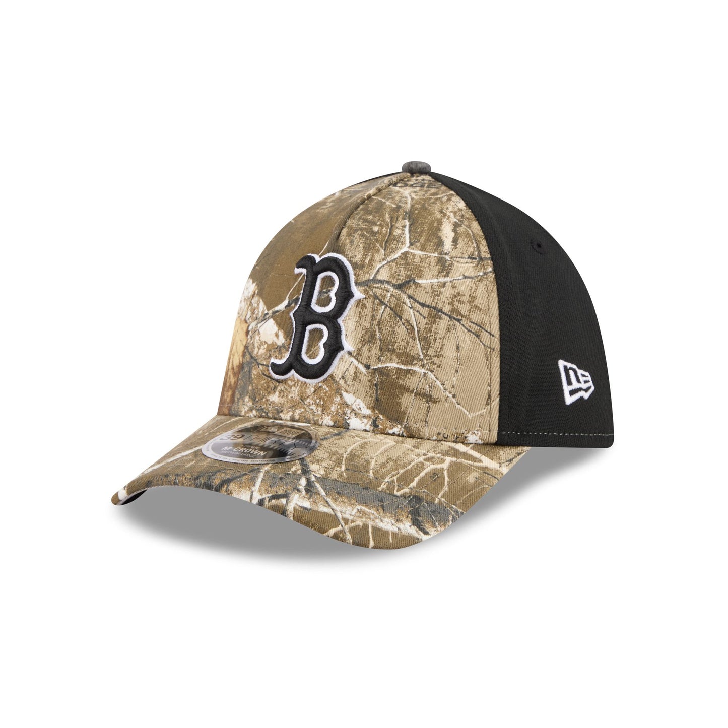 The Boston Red Sox Realtree 39THIRTY M-Crown A-Frame Stretch Fit Cap features an embroidered Red Sox logo at the front, Realtree fabrication panel with a matching team wordmark at the rear and a gray undervisor. Additional details include a Performance Stretch sweatband and a New Era Flag at the left-wear side.