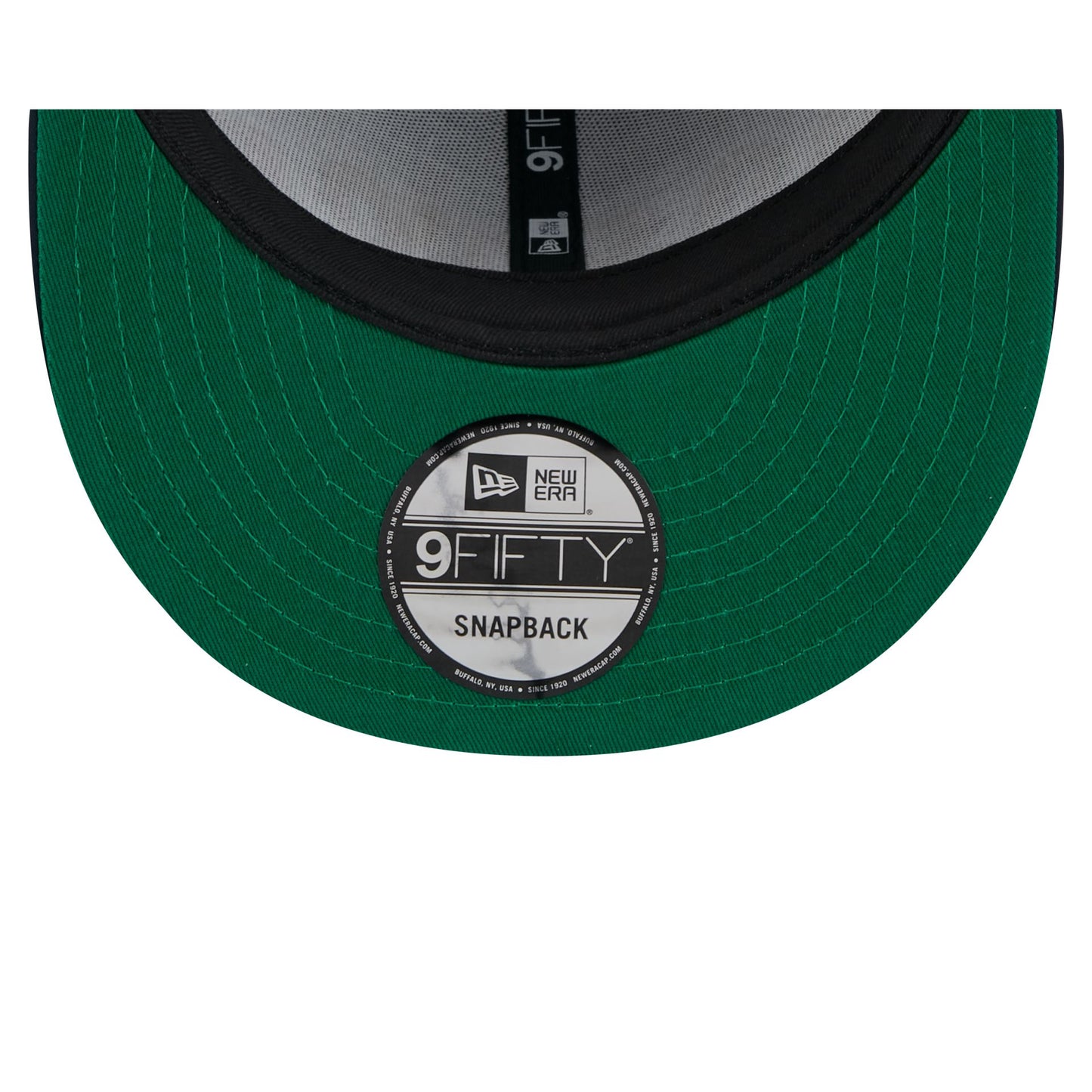The Boston Red Sox Satin Pin 9FIFTY Snapback features an embroidered Red Sox wordmark at the front panels against a satin fabrication throughout the cap and a logo at the right-wear side. Additional details include a New Era Pin at the front left panel a snapback closure at the rear, and a green undervisor.
