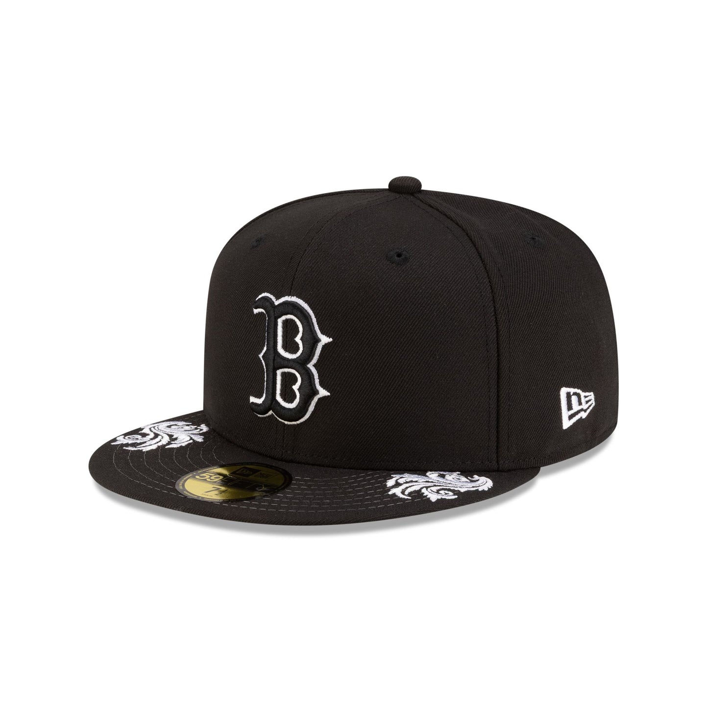 The Boston Red Sox Script Black and White 59FIFTY Fitted Cap features an embroidered Red Sox logo at the front panels with a matching MLB Batterman logo at the rear. Additional details include a team script at the right-wear side with ornamental details throughout the cap and a gray undervisor.