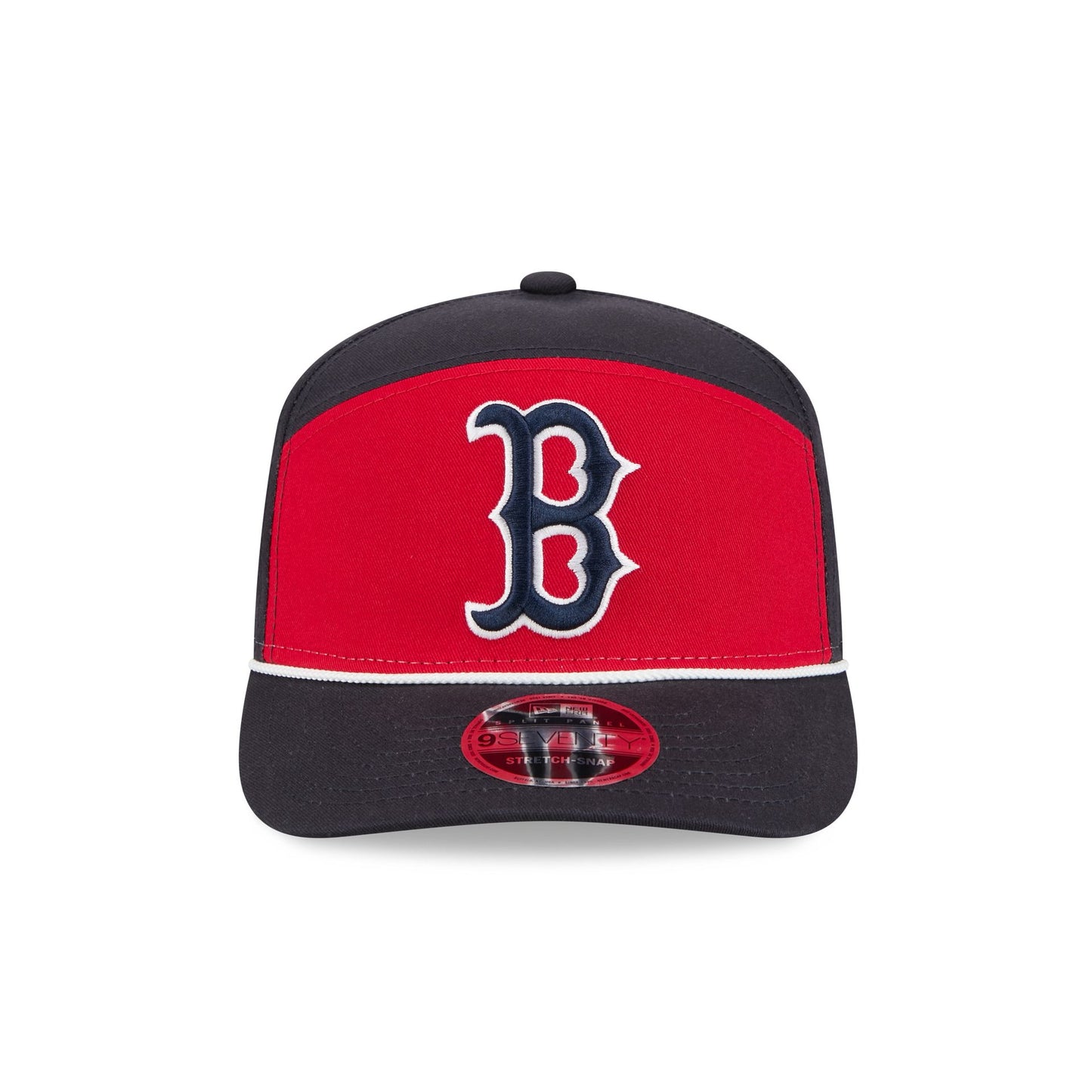 The Boston Red Sox Split Panel 9SEVENTY Stretch-Snap features an embroidered Red Sox logo at the front panel with a split crown construction and a rope at the visor. Additional details include an adjustable stretch-snap closure at the rear and a gray undervisor.