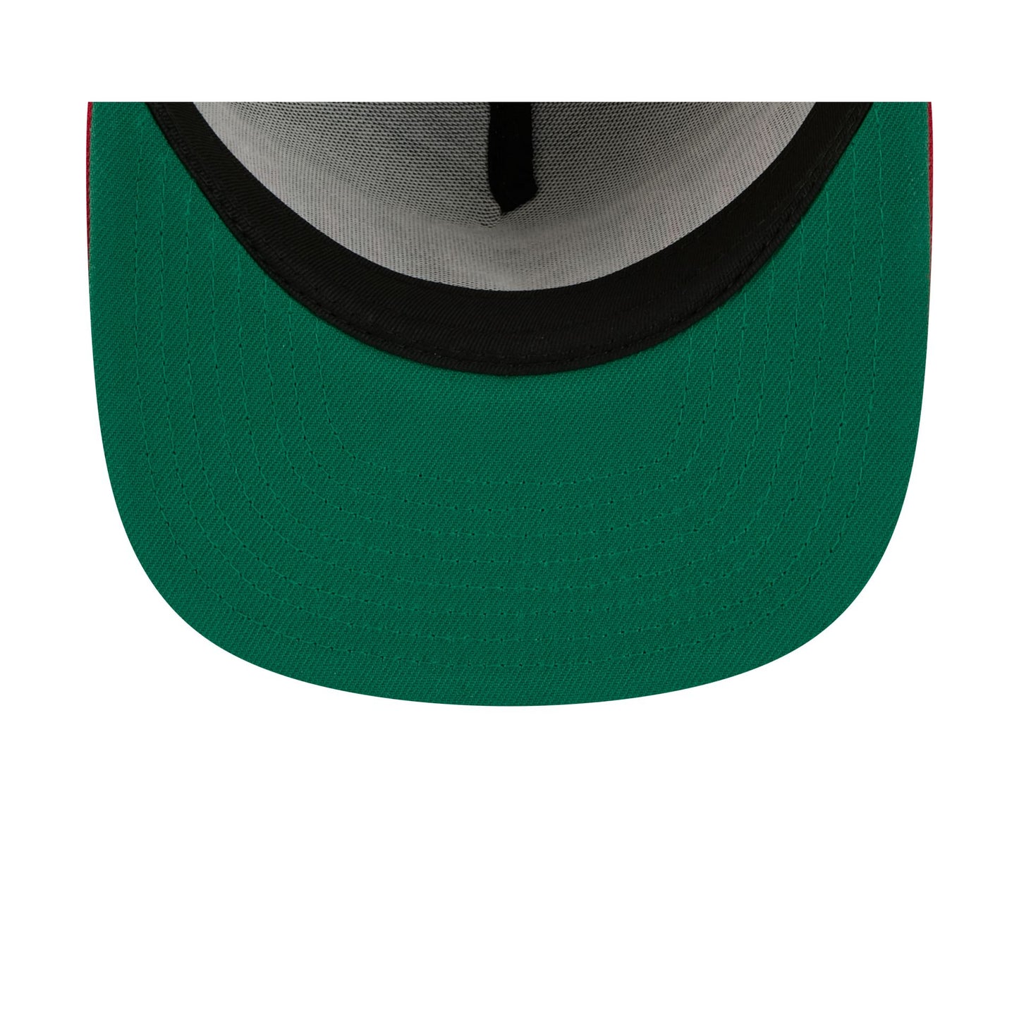 The Boston Red Sox Summer Derby 59FIFTY A-Frame Fitted Cap features an embroidered Red Sox wordmark over team color stripes at the front panels with a matching MLB Batterman logo at the rear. Additional details include a 1999 All-Star Game patch at the right-wear side, a red visor, and a green undervisor.