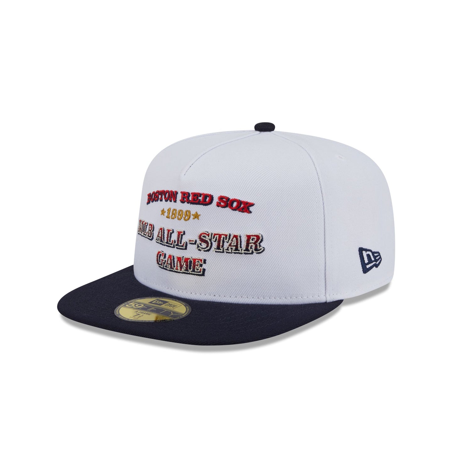 The Boston Red Sox Summer Derby White 59FIFTY A-Frame Fitted Cap features an embroidered Red Sox Cooperstown wordmark and a 1999 All-Star Game wordmark at the front panel with a matching All-Star Game patch at the right-wear side. Additional details include a team color MLB Batterman logo at the rear, a navy visor, and a green undervisor.