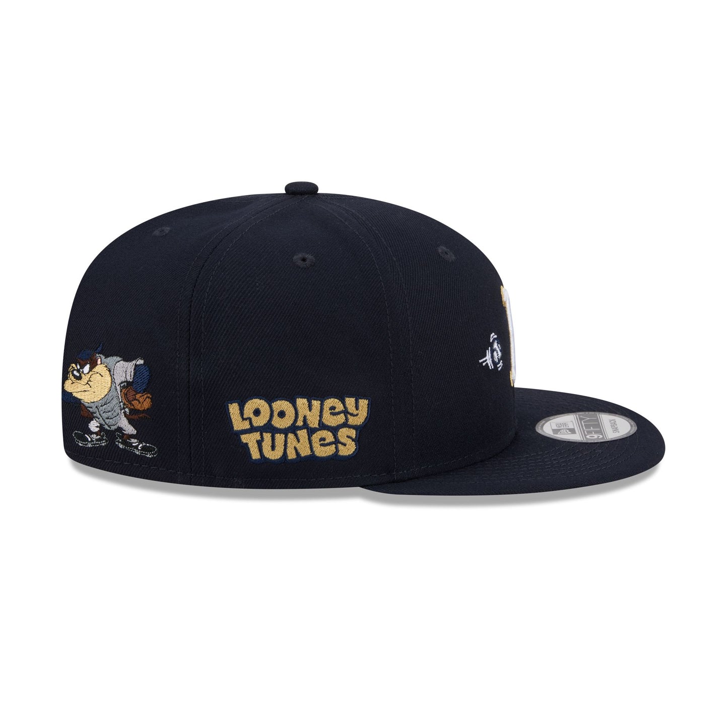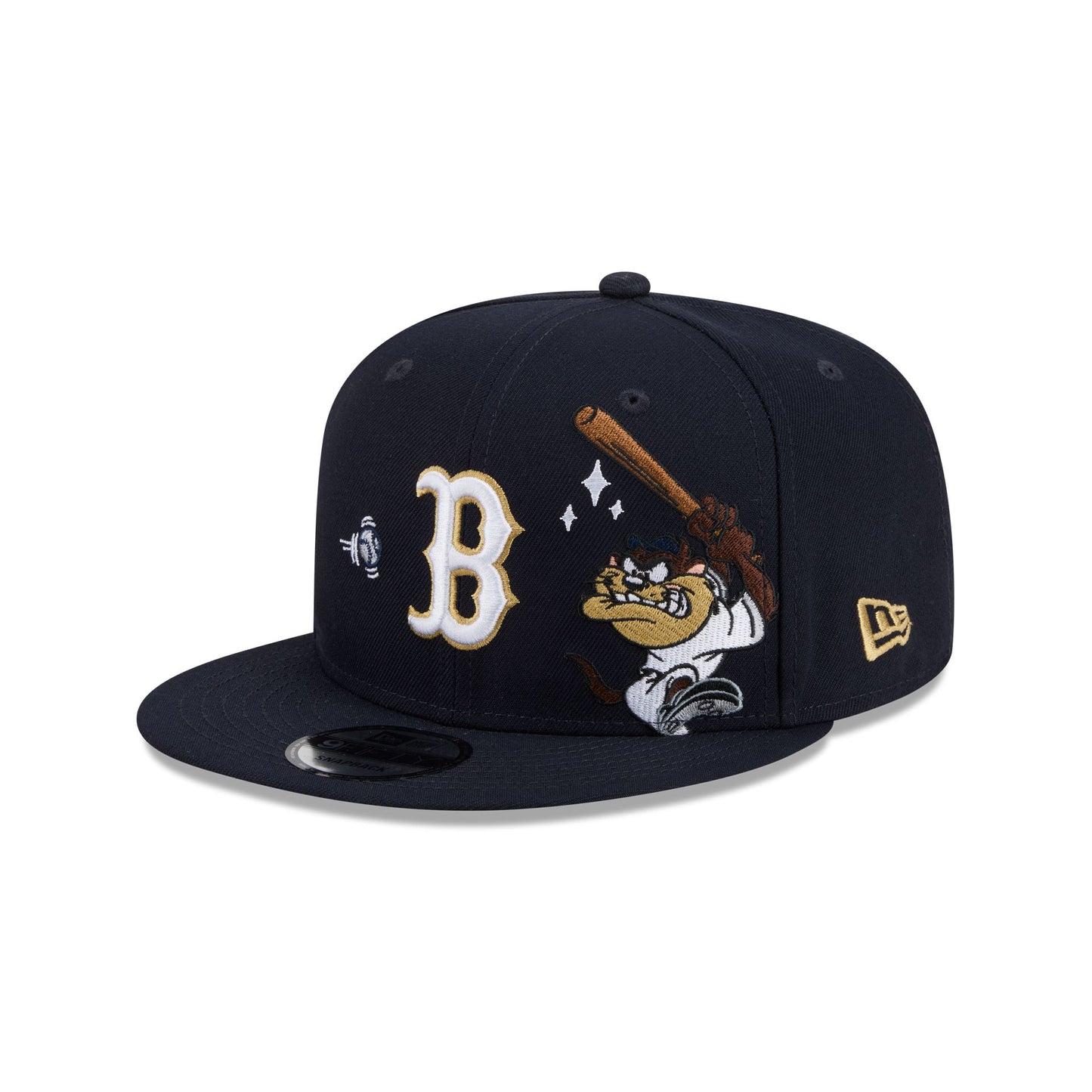 The Boston Red Sox Tasmanian Devil Swing 9FIFTY Snapback features an embroidered Red Sox logo and Tasmanian Devil batting graphic at the front panels with a Looney Tunes logo at the right-wear side. Additional details include a Tasmanian Devil script wordmark above an adjustable snapback closure at the rear and the character's graphic to the right.
