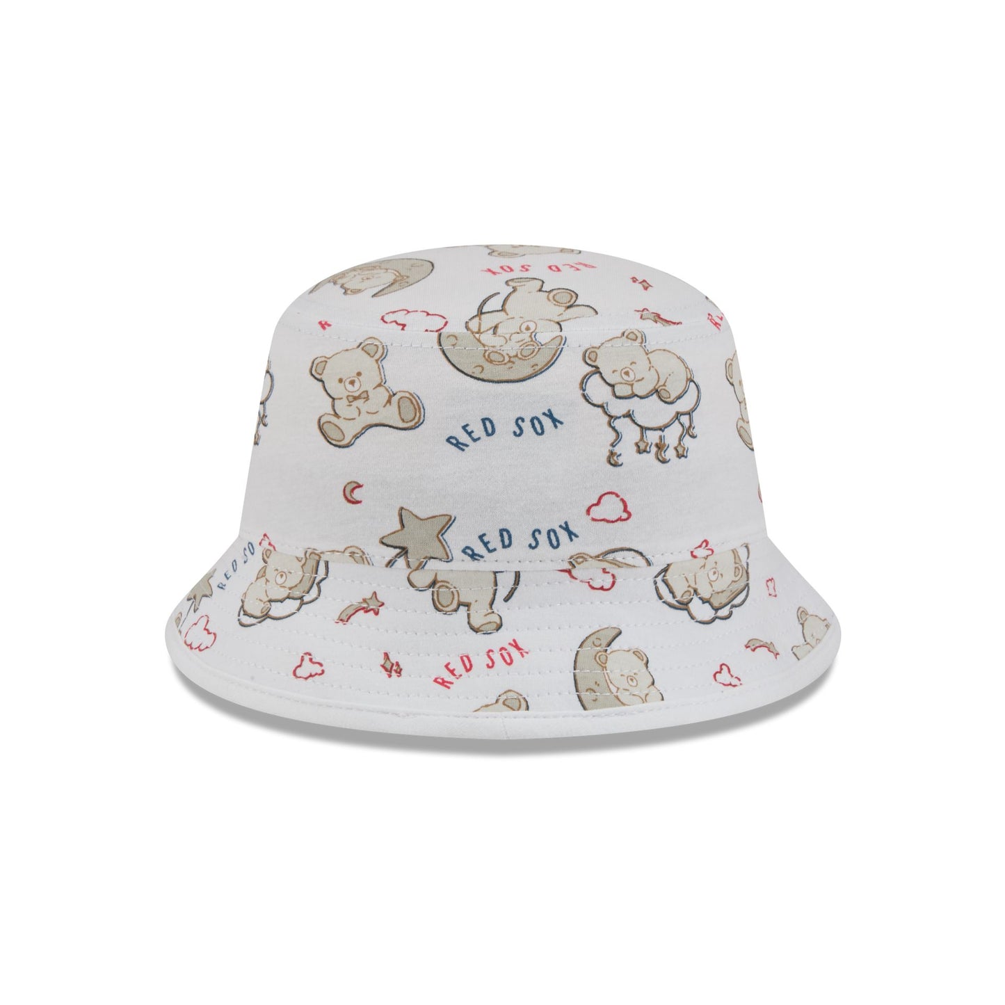 The Boston Red Sox Teddy Kids Bucket Hat features an embroidered Red Sox logo at the front with a teddy bear pattern throughout.