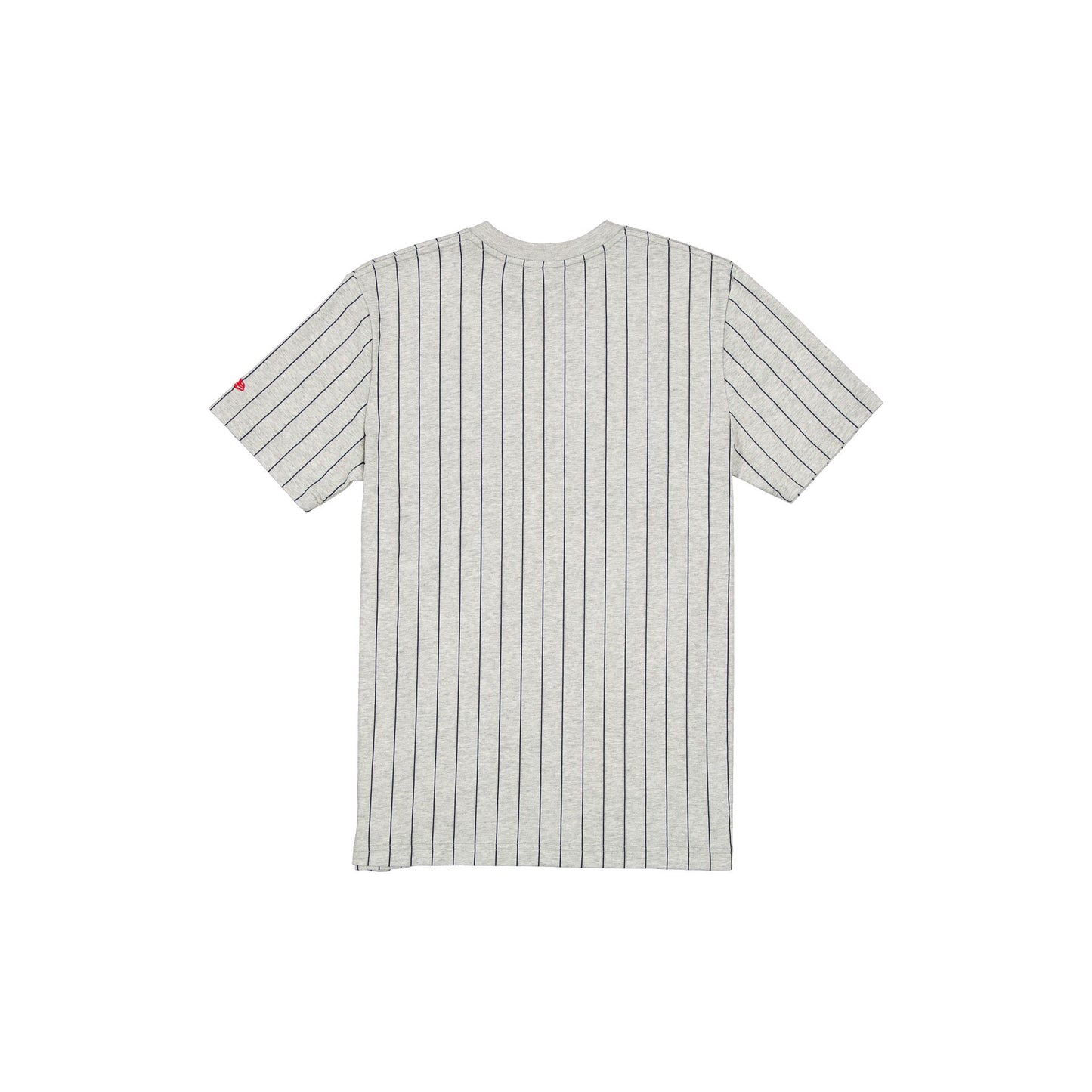 The Boston Red Sox Throwback Retro Gray Pinstripe T-Shirt features an embroidered Red Sox wordmark at the front with a twill applique logo at the left chest.