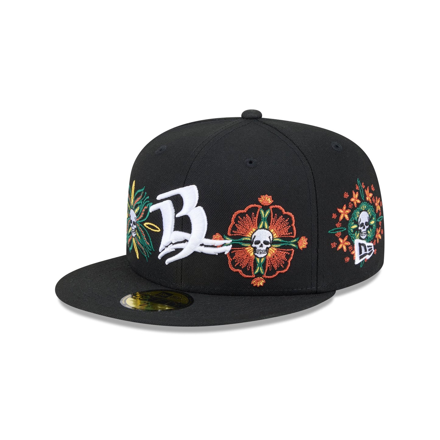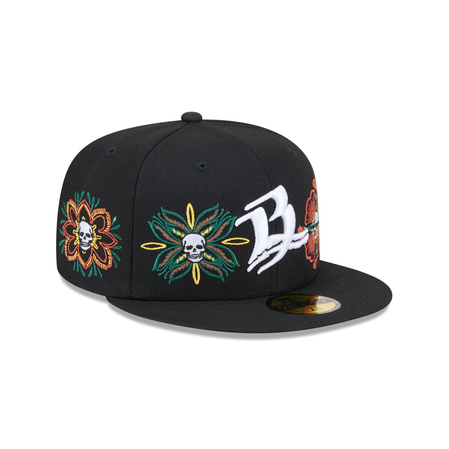 The Bravos de León Day of the Dead Skull & Flowers 59FIFTY Fitted Cap features an embroidered Bravos logo at the front panels with Day of the Dead floral embroidery throughout the cap. Additional details include the LMB logo at the rear and a green undervisor.