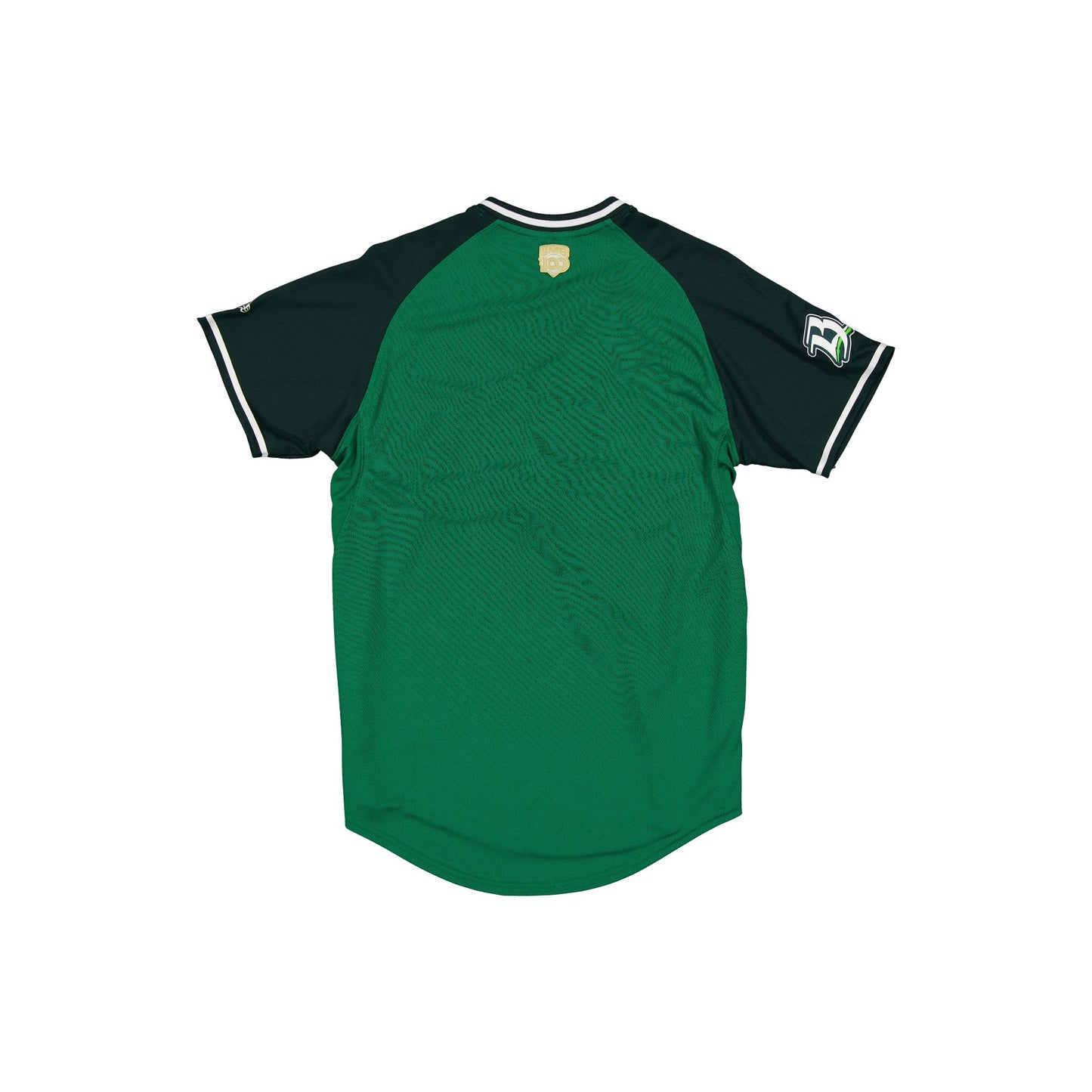 The Bravos de León LMB 100th Anniversary Away Jersey features an embroidered Bravos home name at the chest with a New Era Official Merchandise patch at the front hemline, a team logo at the right sleeve, and a LMB 100th Anniversary logo at the rear.