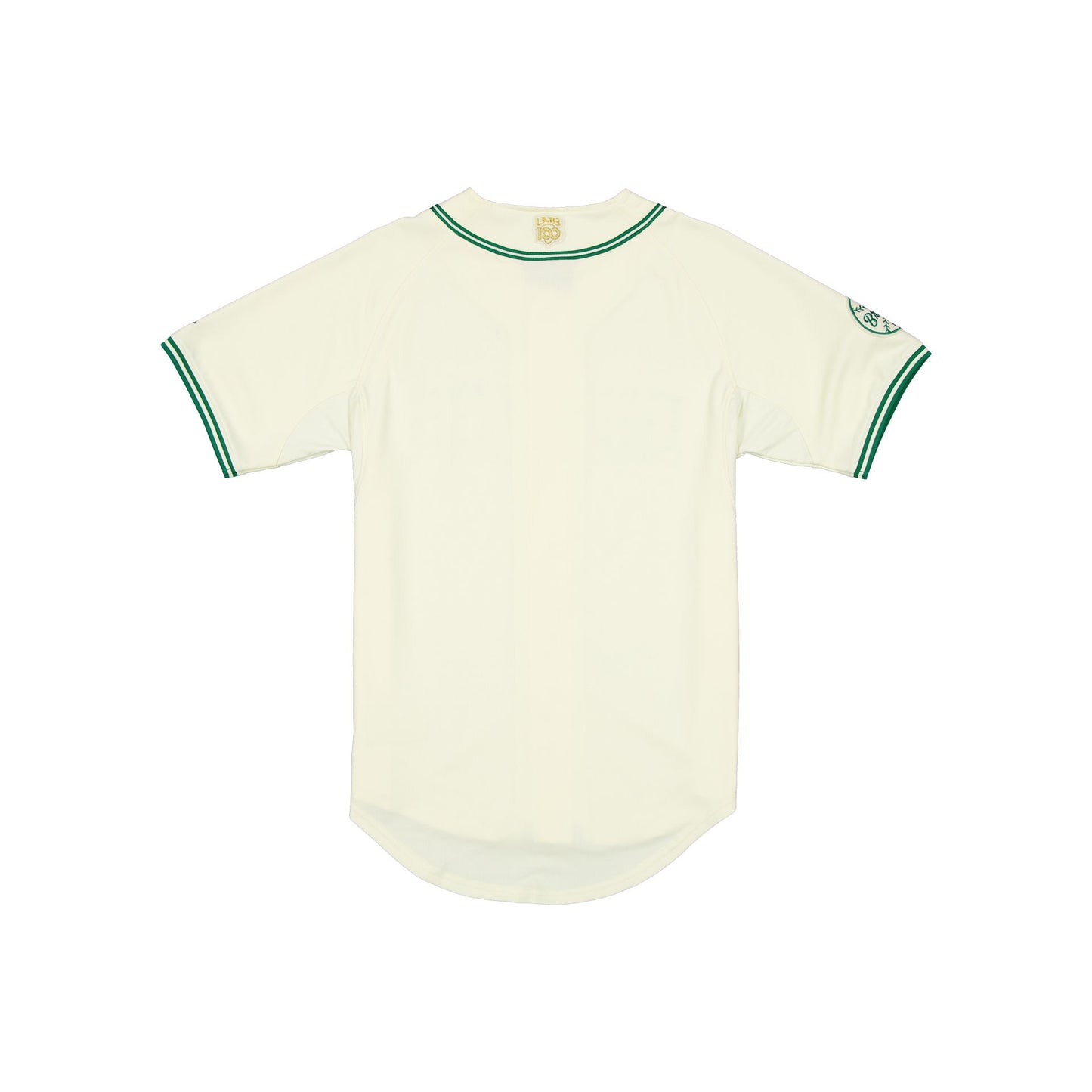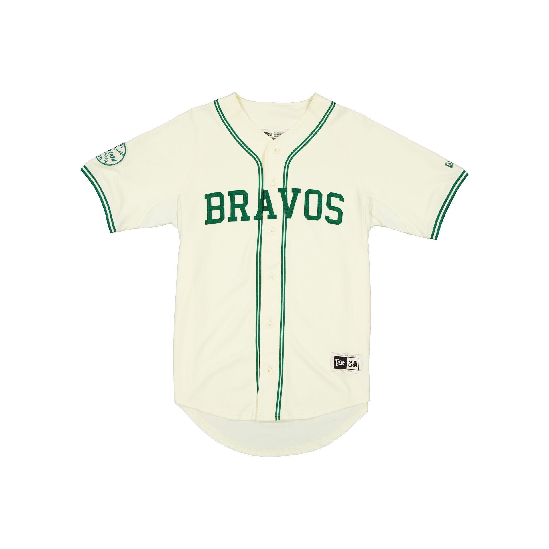The Bravos de León Retro Jersey features an embroidered Bravos applique logo at the chest with a New Era Official Merchandise patch at the front, a team patch at the right-wear sleeve, and a LMB logo at the rear.