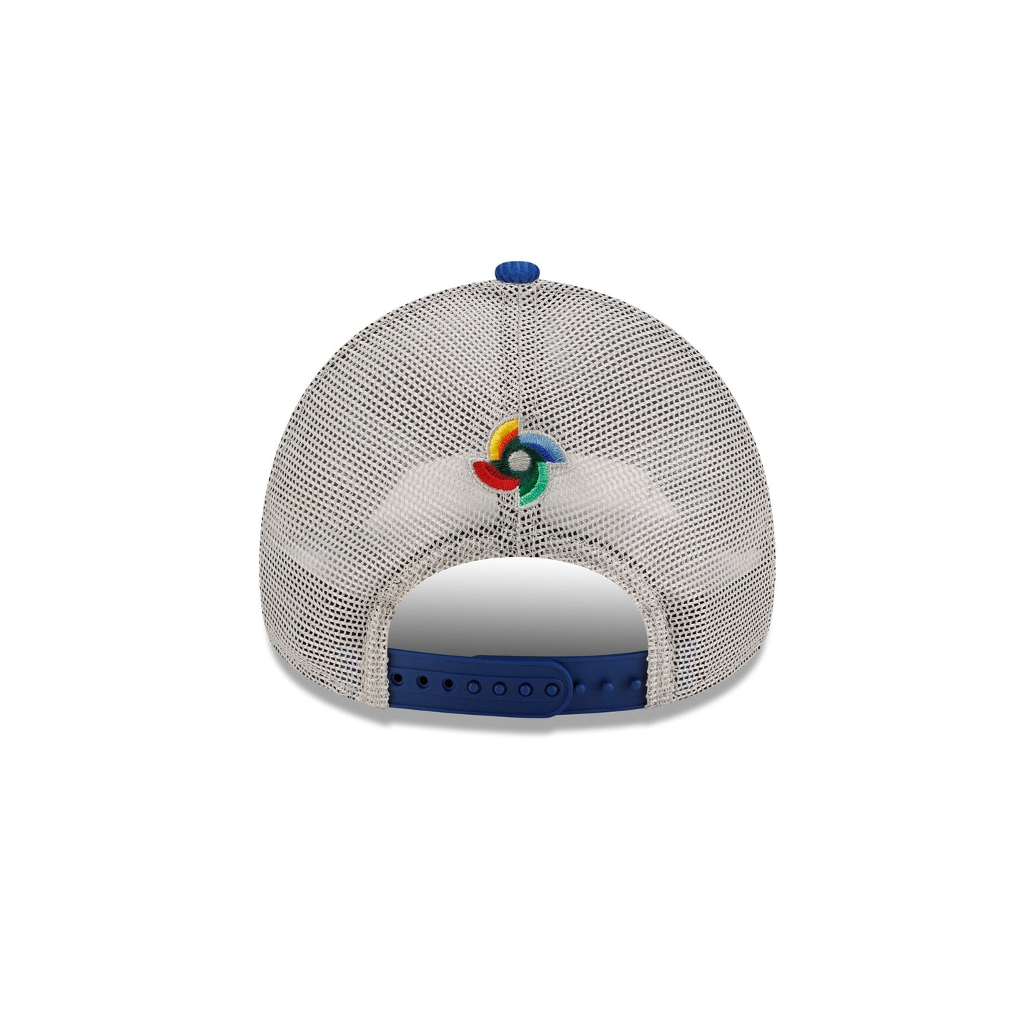 The Brazil 2025 World Baseball Classic 9FORTY A-Frame Trucker features an embroidered Brazil logo at the front panels with a World Baseball Classic logo above an adjustable snapback closure at a mesh rear.