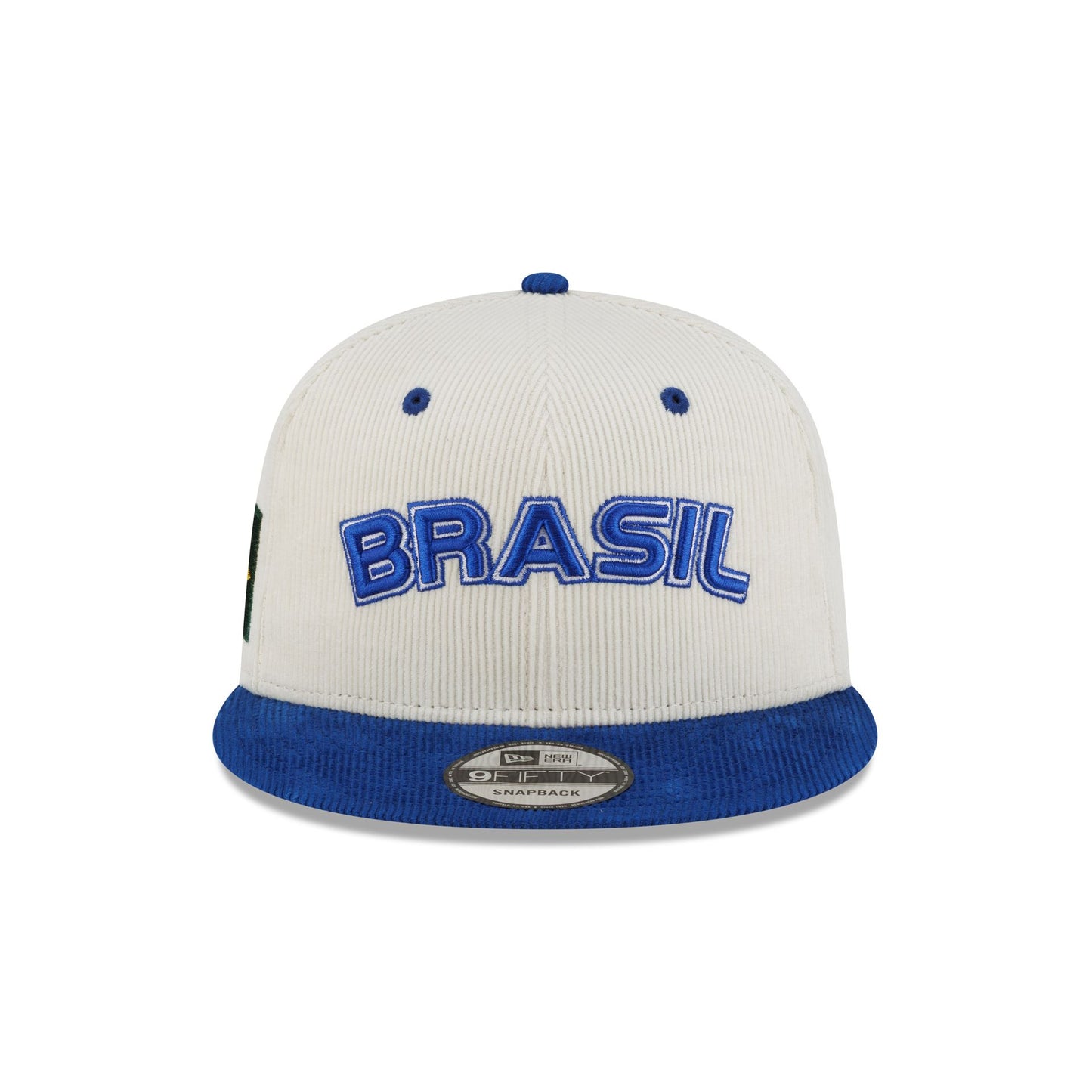 The Brazil 2025 World Baseball Classic Corduroy 9FIFTY Snapback features an embroidered Brazil wordmark at the front panels against a corduroy fabrication with their Flag at the right-wear side. Additional details include the World Baseball Classic logo above an adjustable snapback closure at the rear and a green undervisor.
