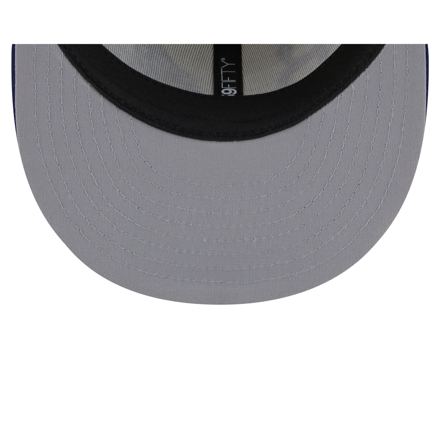 The Brooklyn Dodgers Jackie Robinson Chrome White 59FIFTY Fitted Cap features an embroidered Dodgers logo at the right panel and the player's signature and number at the right. Additional details include an MLB Batterman logo at the rear and a gray undervisor.