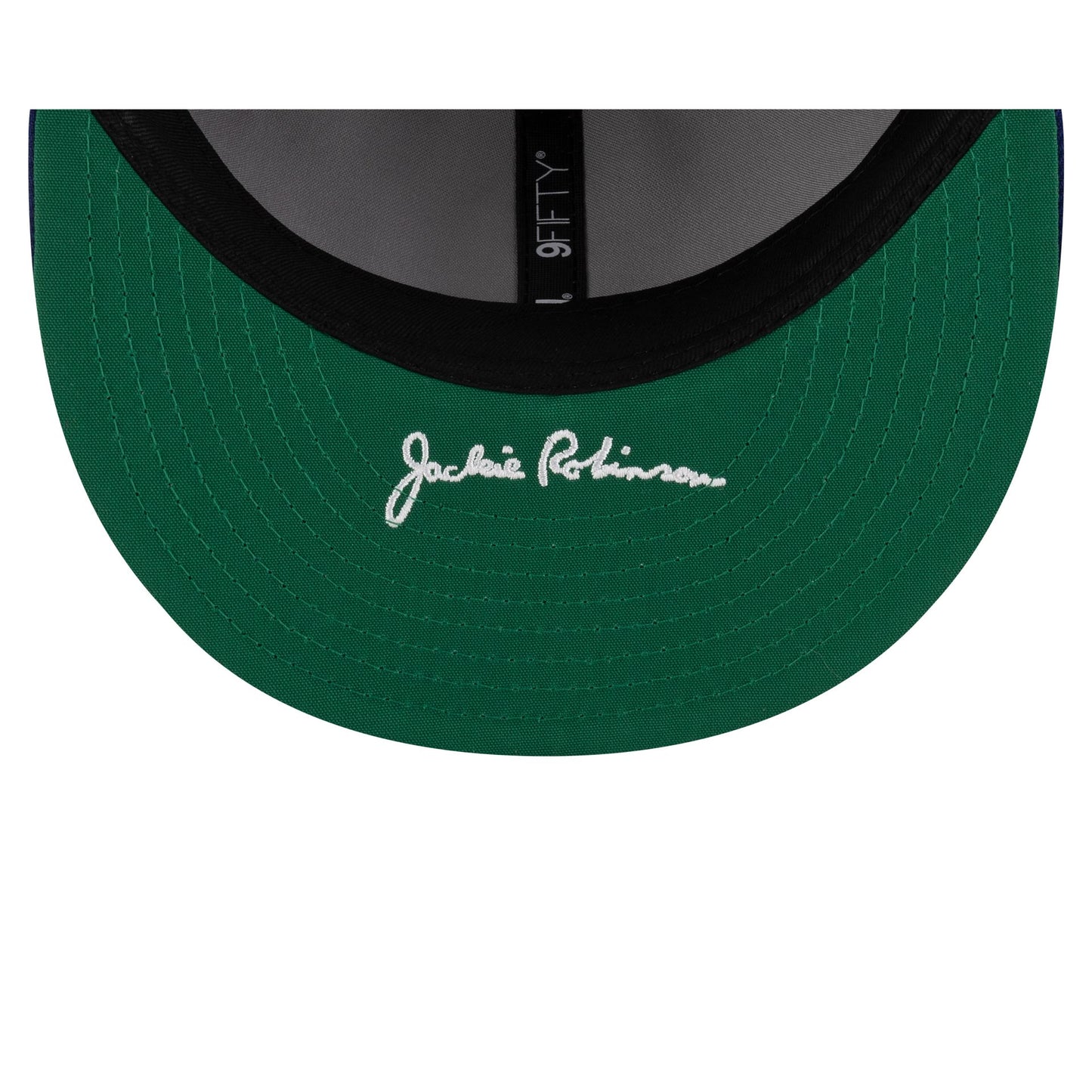 The Brooklyn Dodgers Jackie Robinson Day 2025 Retro Crown 9FIFTY Snapback features an embroidered Dodgers Cooperstown logo at the front panels with an MLB Batterman logo above a snapback closure at the rear. Additional details include a Jackie Robinson pin at the left panel and Robinson's embroidered signature on a green undervisor.