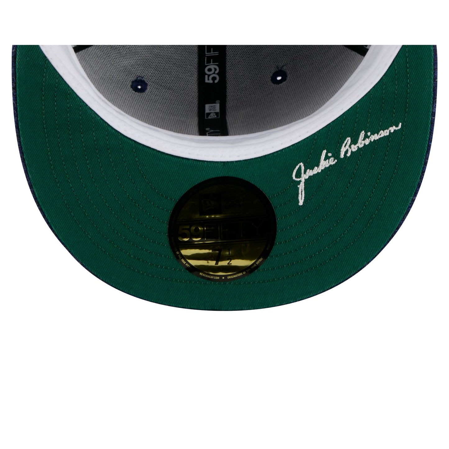The Brooklyn Dodgers Jackie Robinson Shetland Moon 59FIFTY Fitted Cap features an embroidered Dodgers logo at the front panels with a Shetland Moon fabrication throughout and a satin Moon tag woven to the right-wear side. Additional details include the MLB Batterman logo at the rear and Jackie Robinson embroidered at a green undervisor.