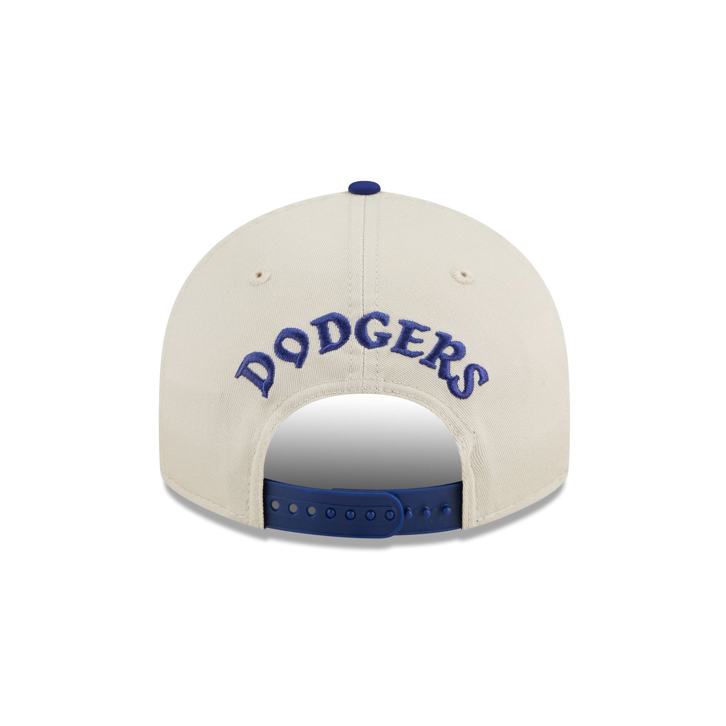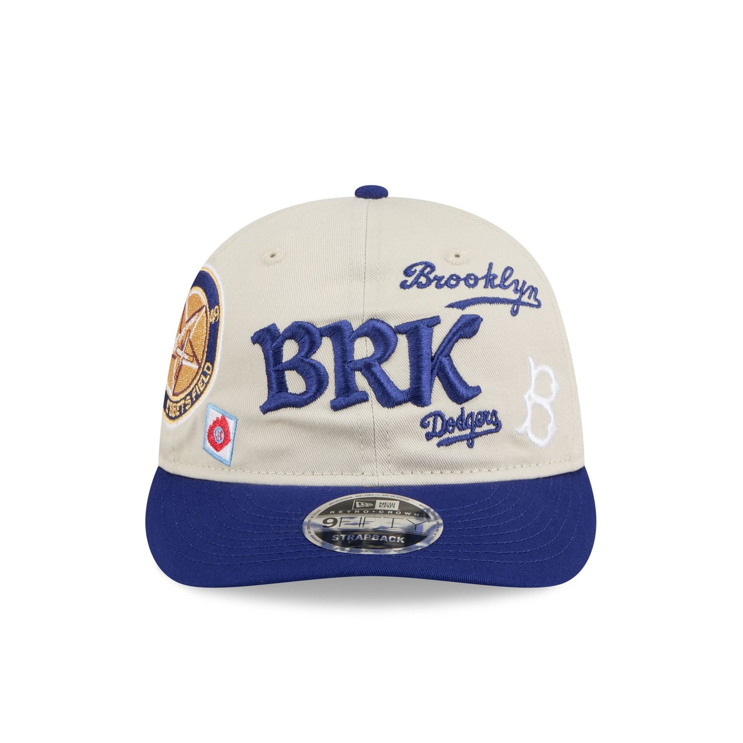 The Brooklyn Dodgers Scattered Patches Retro Crown 9FIFTY Snapback features an embroidered Dodgers city abbreviation with multiple team logos and patches at the front panels. Additional details include a team wordmark above a snapback closure at the rear with a team color visor and a gray undervisor.