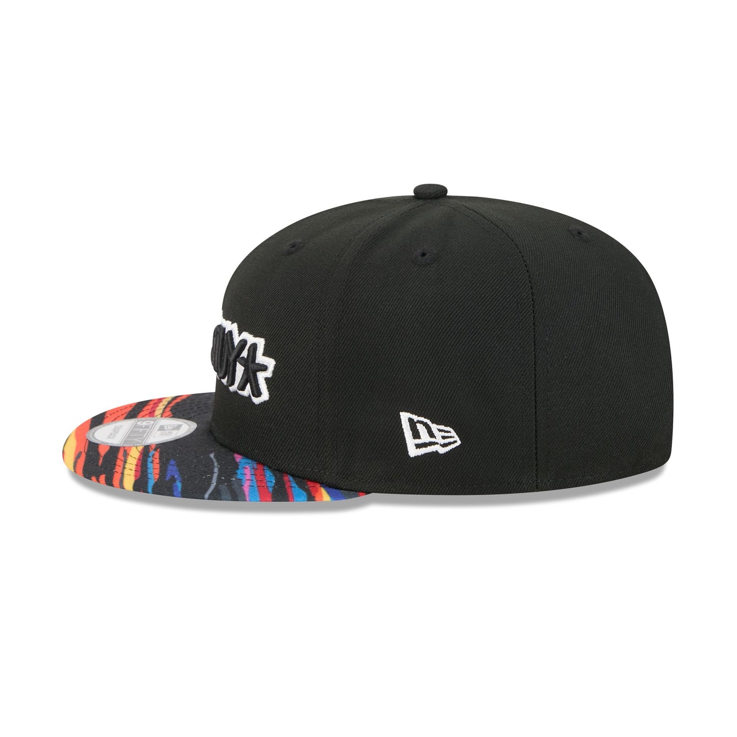 The Brooklyn Nets 2025 City Edition 9FIFTY Snapback features an embroidered Nets City Edition logo at the front panels with a logo at the right-wear side. Additional details include the NBA Logoman above an adjustable snapback closure at the rear and a gray undervisor.