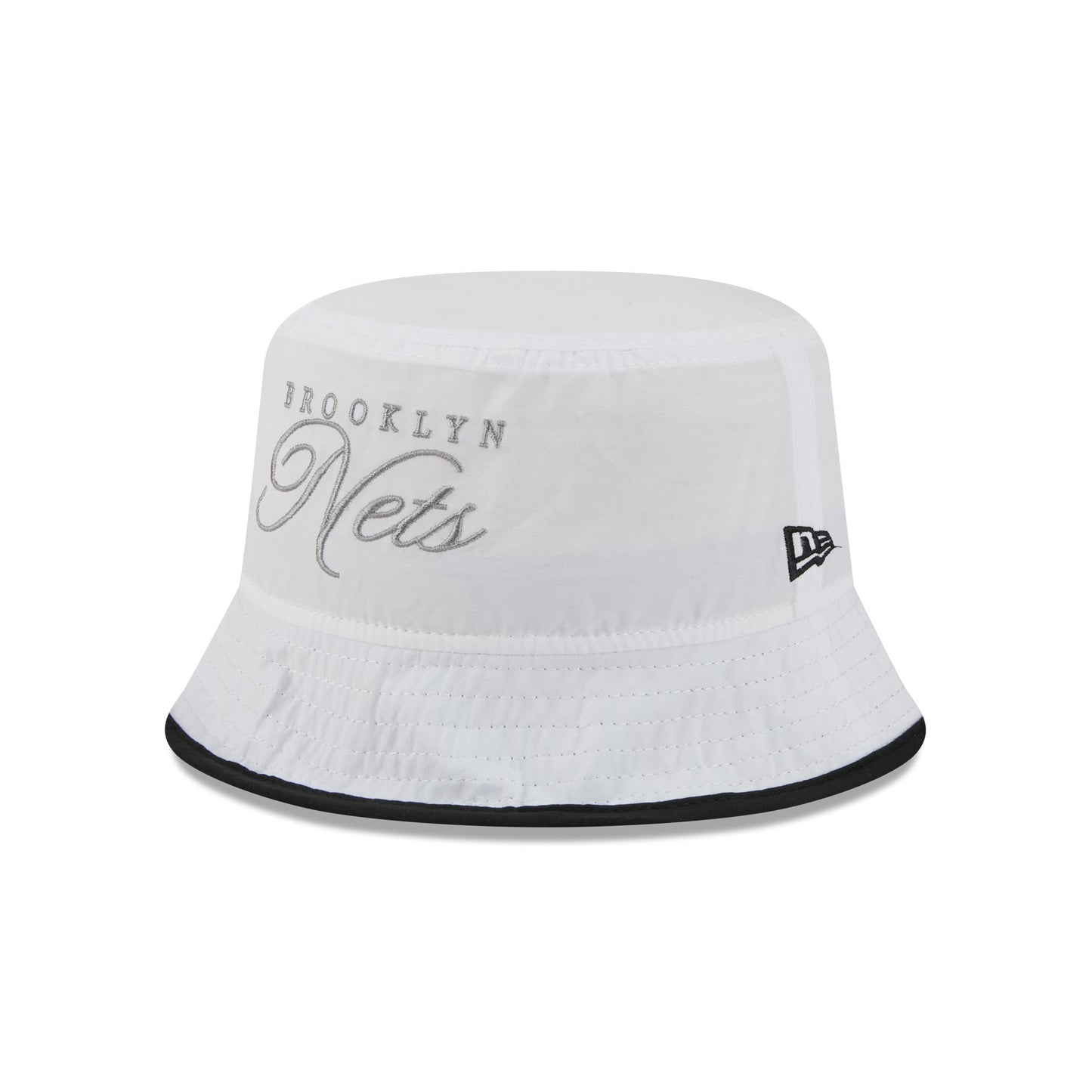 The Brooklyn Nets 2025 Draft Bucket Hat features an embroidered Nets script wordmark at the front with a team logo at the right-wear side. Additional details include a silicone NBA Logoman on a woven tag at the rear.