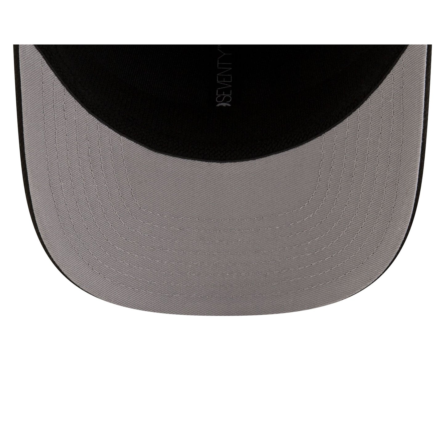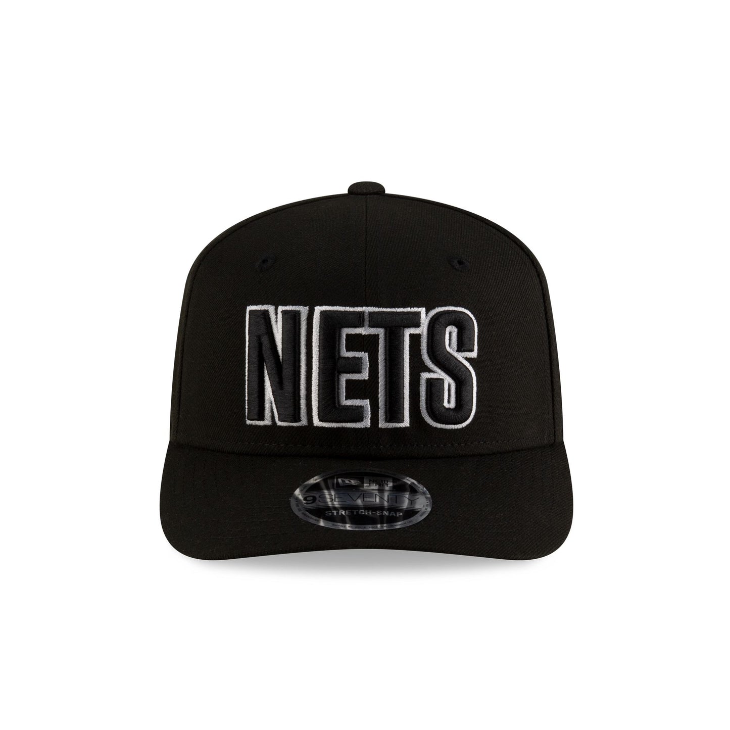The Brooklyn Nets 2025 Statement Edition 9SEVENTY Stretch-Snap features an embroidered Nets Statement Edition logo at the front panels with a logo at the right-wear side. Additional details include the NBA Logoman above an adjustable stretch-snap closure at the rear and a gray undervisor.