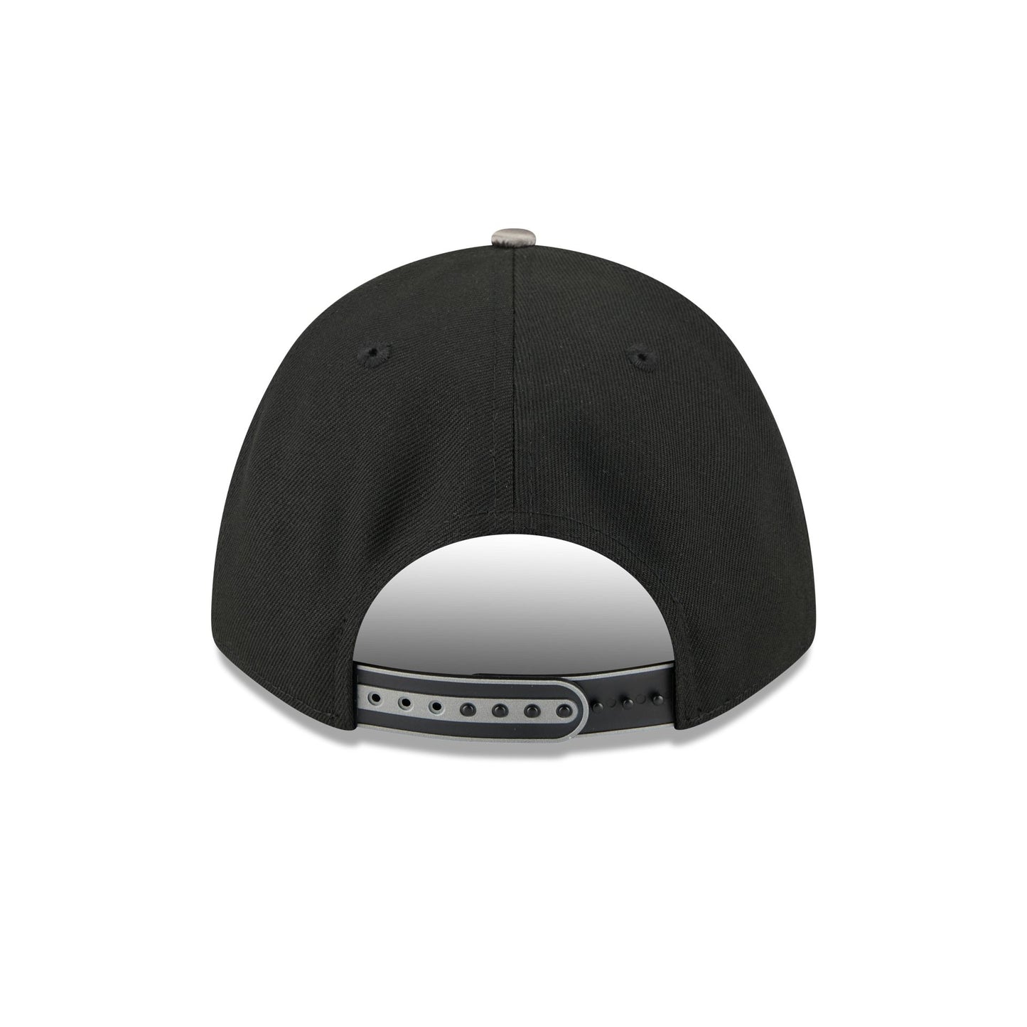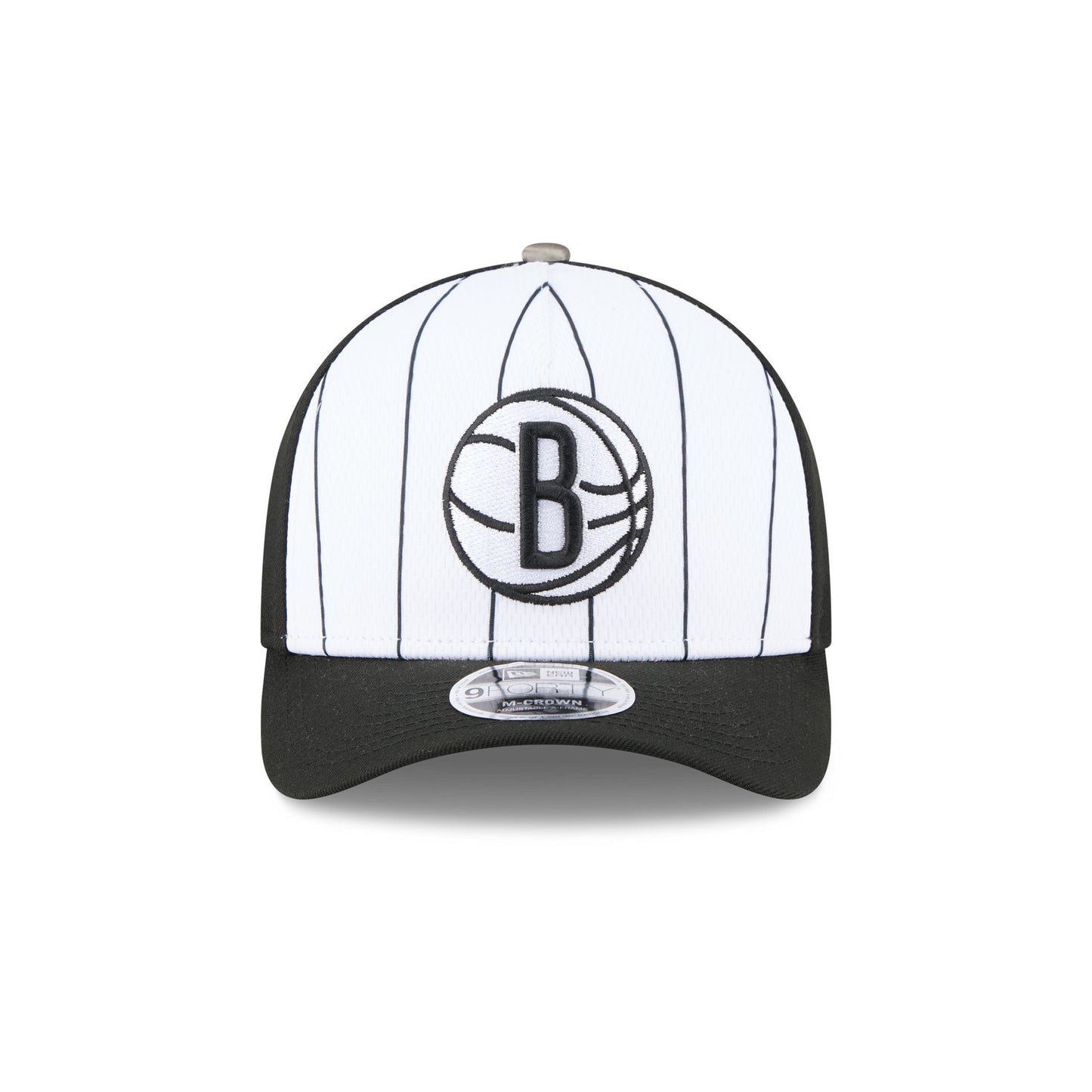 The Brooklyn Nets 2025 Tip-Off 9FORTY M-Crown A-Frame Snapback features an embroidered Nets logo at the front panels against a pinstripe jersey fabrication with the NBA Logoman at the right-wear side. Additional details include an adjustable snapback closure at the rear and a gray undervisor.