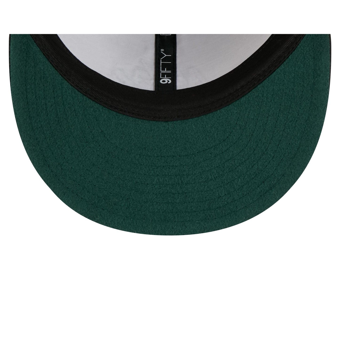 The Brooklyn Nets Chainstitch Script Retro Crown 9FIFTY Snapback features a chainstitch embroidered Nets script at the front panels with a matching team logo at the right-wear side, an adjustable snapback closure at the rear, and a green Melton wool undervisor.