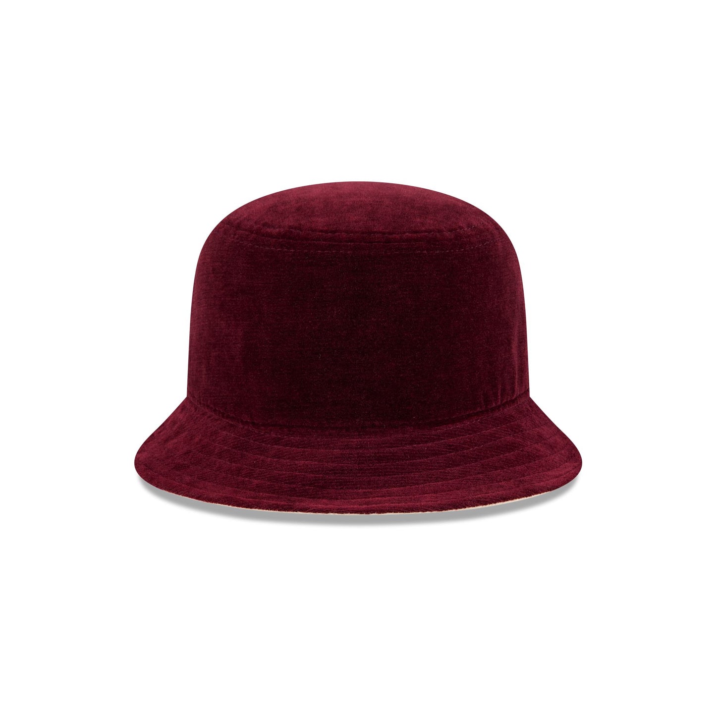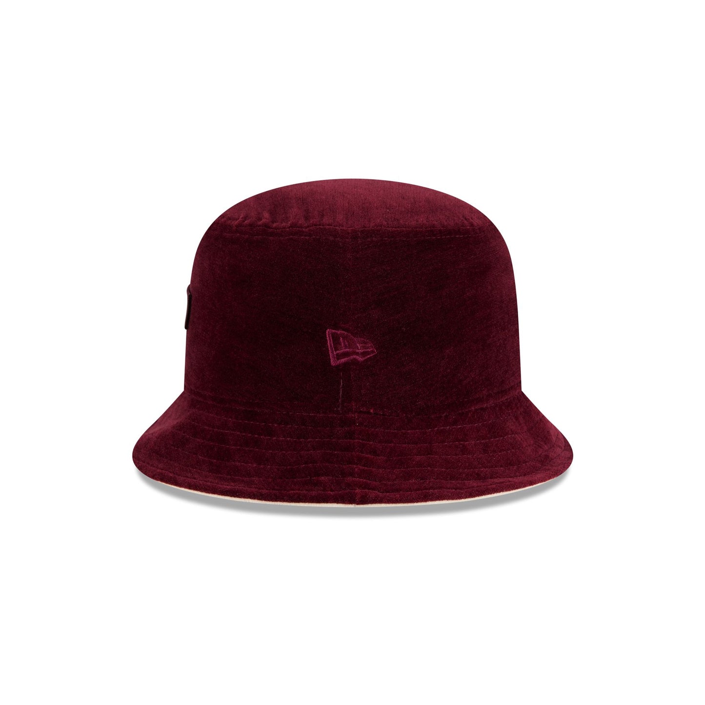 The Brooklyn Nets Fall Velvet Bucket Hat features a woven Nets tag at the front with a red velvet fabrication throughout.
