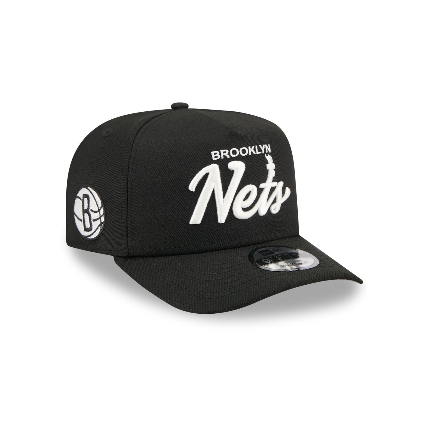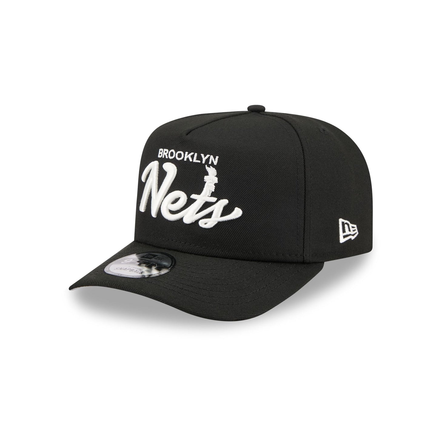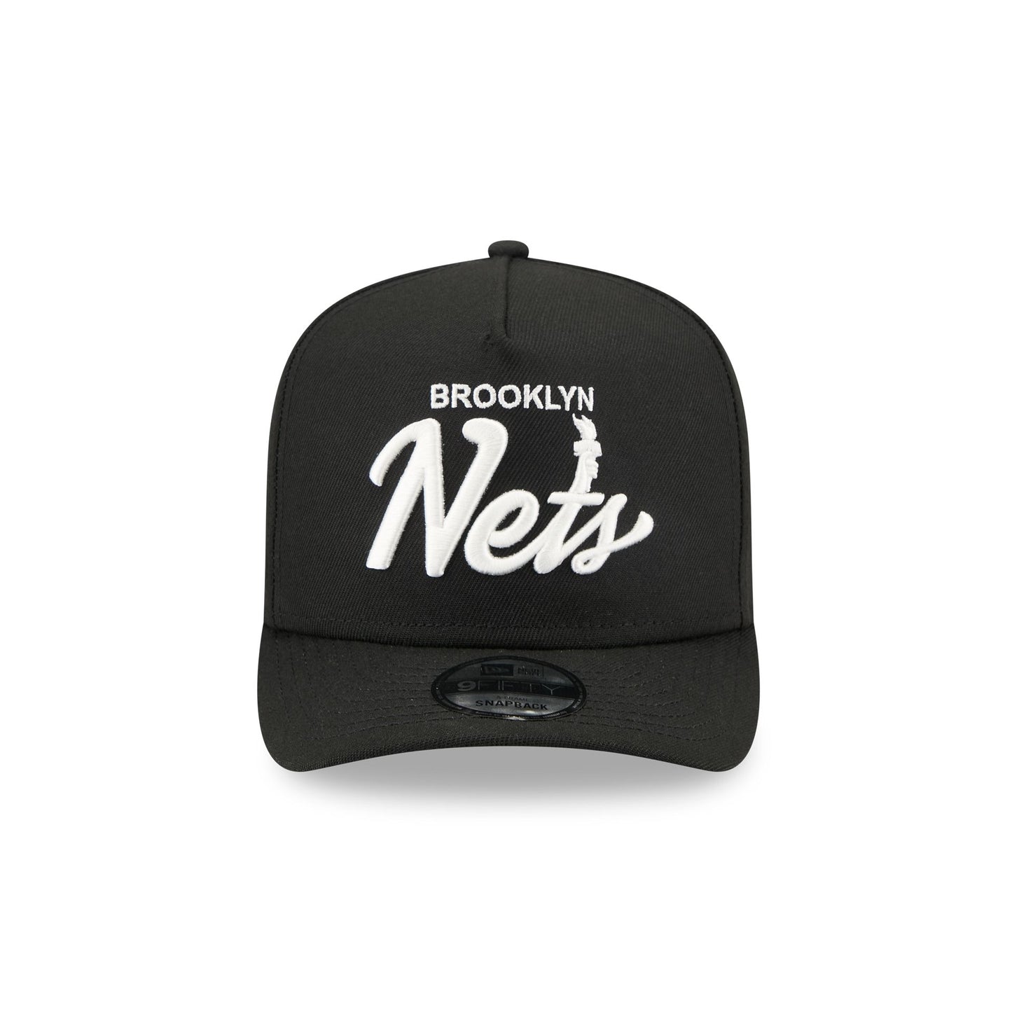 The Brooklyn Nets Local Play 9FIFTY A-Frame Snapback features an embroidered Nets themed script wordmark at the front panels with a logo at the right-wear side. Additional details include an adjustable snapback closure at the rear and a gray undervisor.