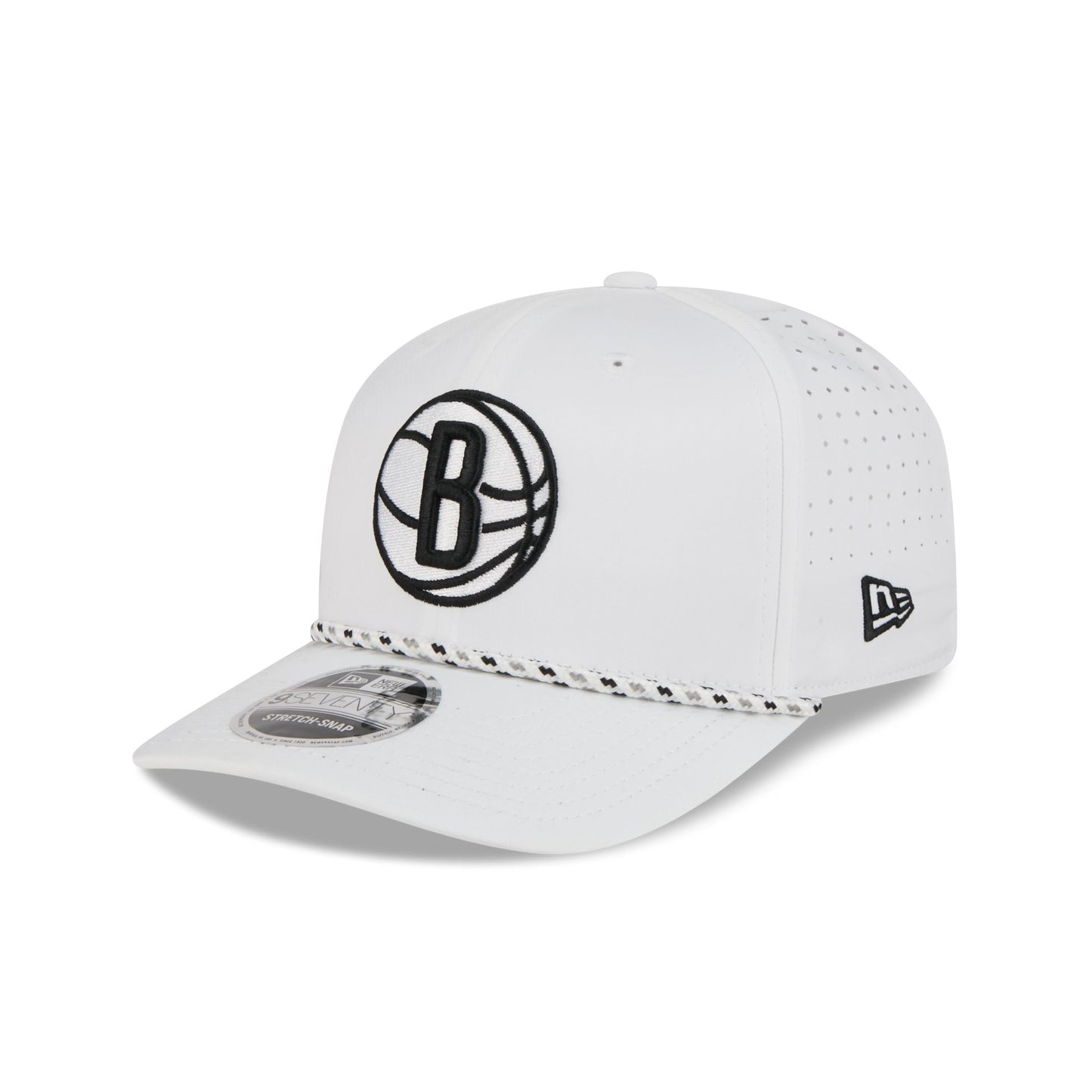 The Brooklyn Nets Optic White Performance Rope 9SEVENTY Stretch-Snap features an embroidered Nets logo at the front panels with a performance fabric throughout. Additional details include a rope at the visor, an adjustable stretch-snap closure at a performance mesh rear, and a team color undervisor.