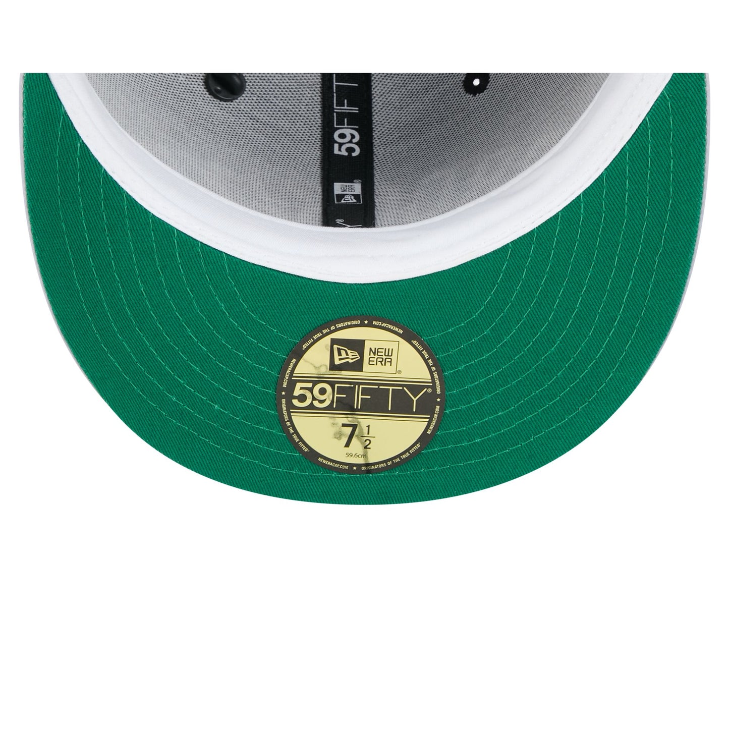 The Brooklyn Nets Spring Satin 59FIFTY Fitted Cap features an embroidered Nets wordmark at the front panels with a New Era pin at the top left panel and an NBA Logoman at the rear. Additional details include a satin fabrication throughout, a logo at the right-wear side, and a green undervisor.