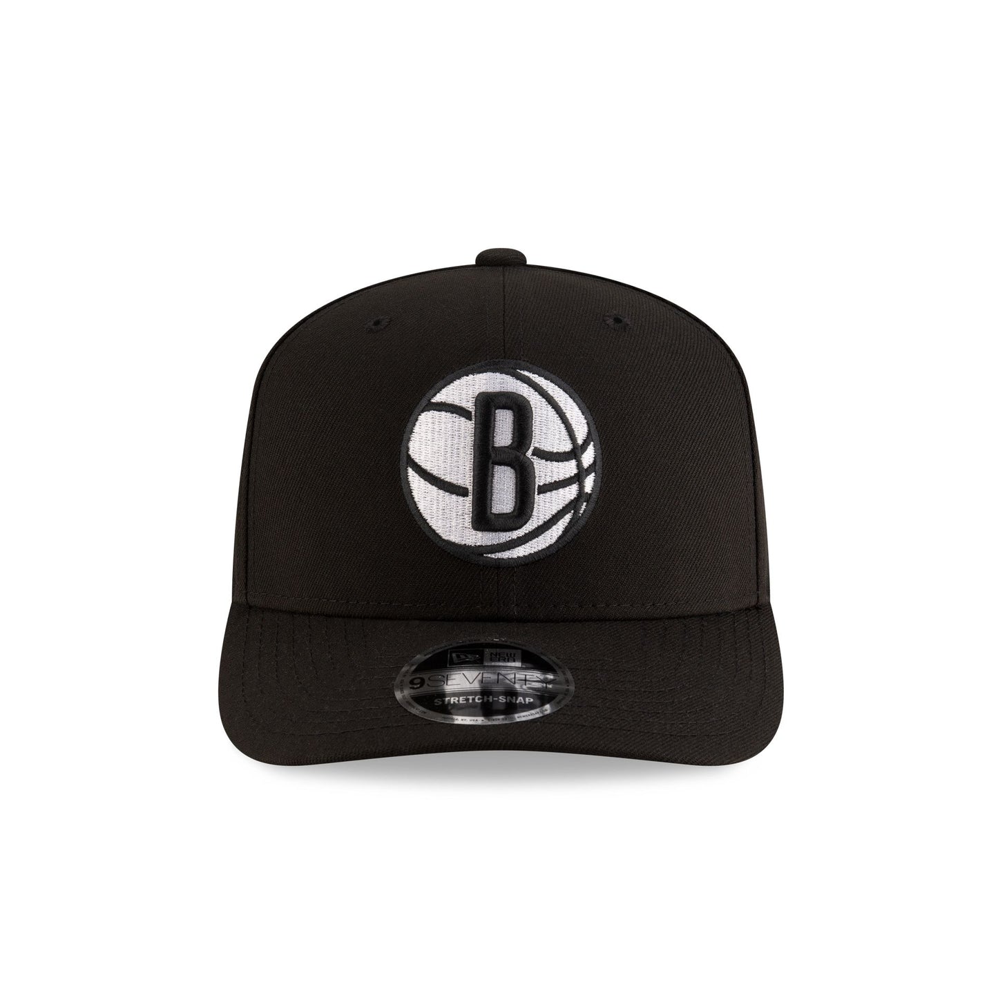 The Brooklyn Nets Team 9SEVENTY Stretch-Snap features an embroidered Nets logo at the front panels with the NBA Logoman above an adjustable stretch-snap closure at the rear and a gray undervisor.
