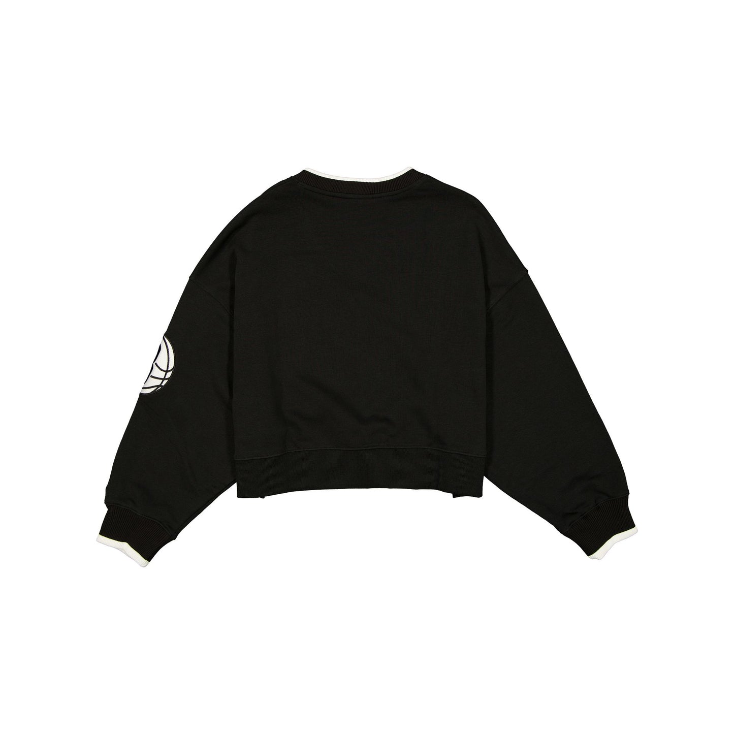 The Brooklyn Nets Throwback Prep Women's Cropped Crewneck features a screen-printed Nets wordmark at the chest with an embroidered script wordmark below. Additional details include an embroidered logo at the left arm and a cropped fit.