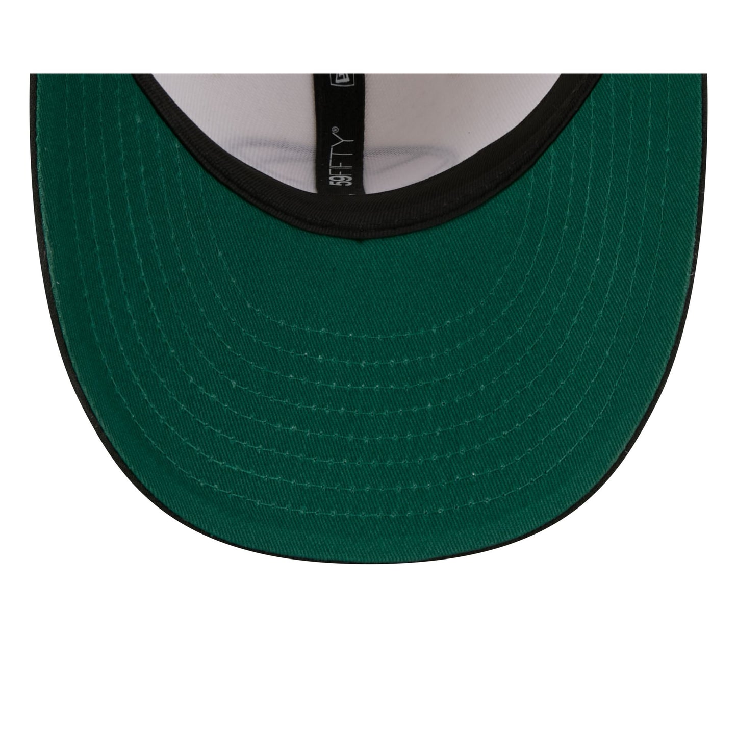 The Brooklyn Nets Tonal Florals White Pre-Curved 59FIFTY Fitted Cap features an embroidered Nets logo at the front panels with a team color visor and a green undervisor. Additional details include chainstitched embroidered flowers with handstitched beading at the left-wear side and a matching NBA Logoman at the rear.