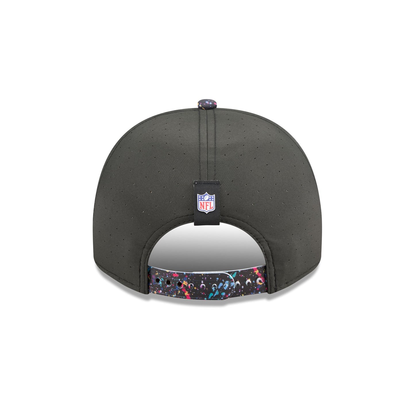 The Buffalo Bills 2025 Crucial Catch 9FIFTY A-Frame Snapback features an embroidered Bills logo at the front paint splatter panels with a woven NFL Shield tag above a snapback closure at the rear. Additional details include a Crucial Catch Intercept Cancer patch at the right-wear side and a black undervisor.