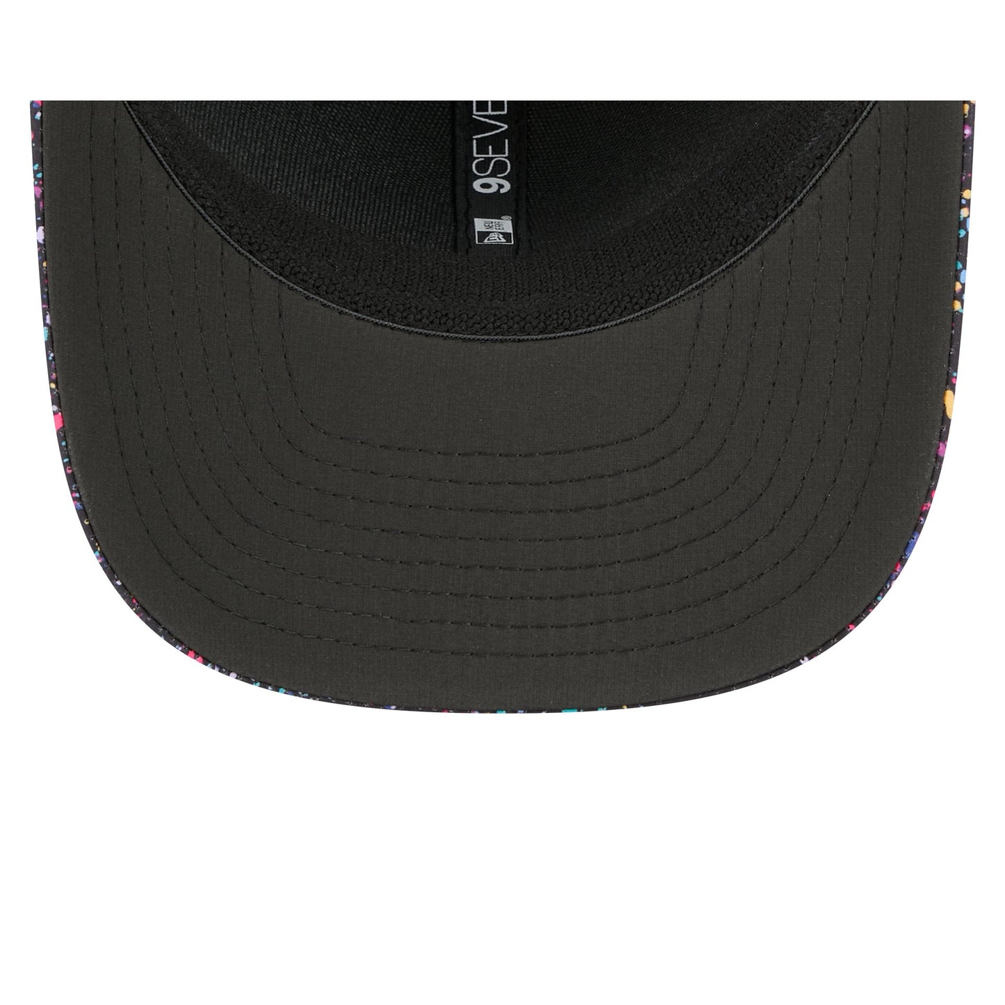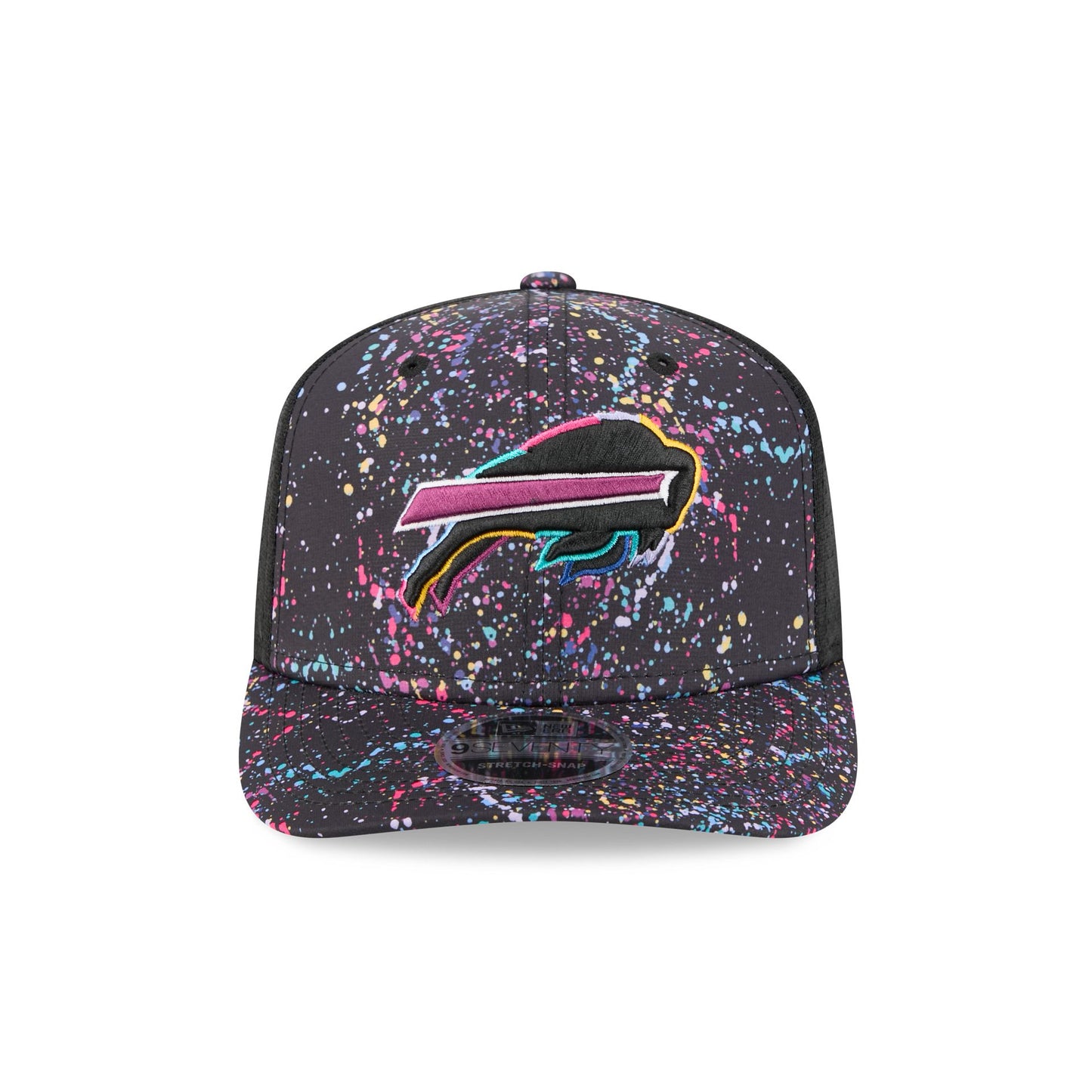 The Buffalo Bills 2025 Crucial Catch 9SEVENTY Trucker features an embroidered Bills logo at the front paint splatter panels with a woven NFL Shield tag above a snapback closure at the rear. Additional details include a Crucial Catch Intercept Cancer patch at the right-wear side with performance mesh rear panels and a black undervisor.