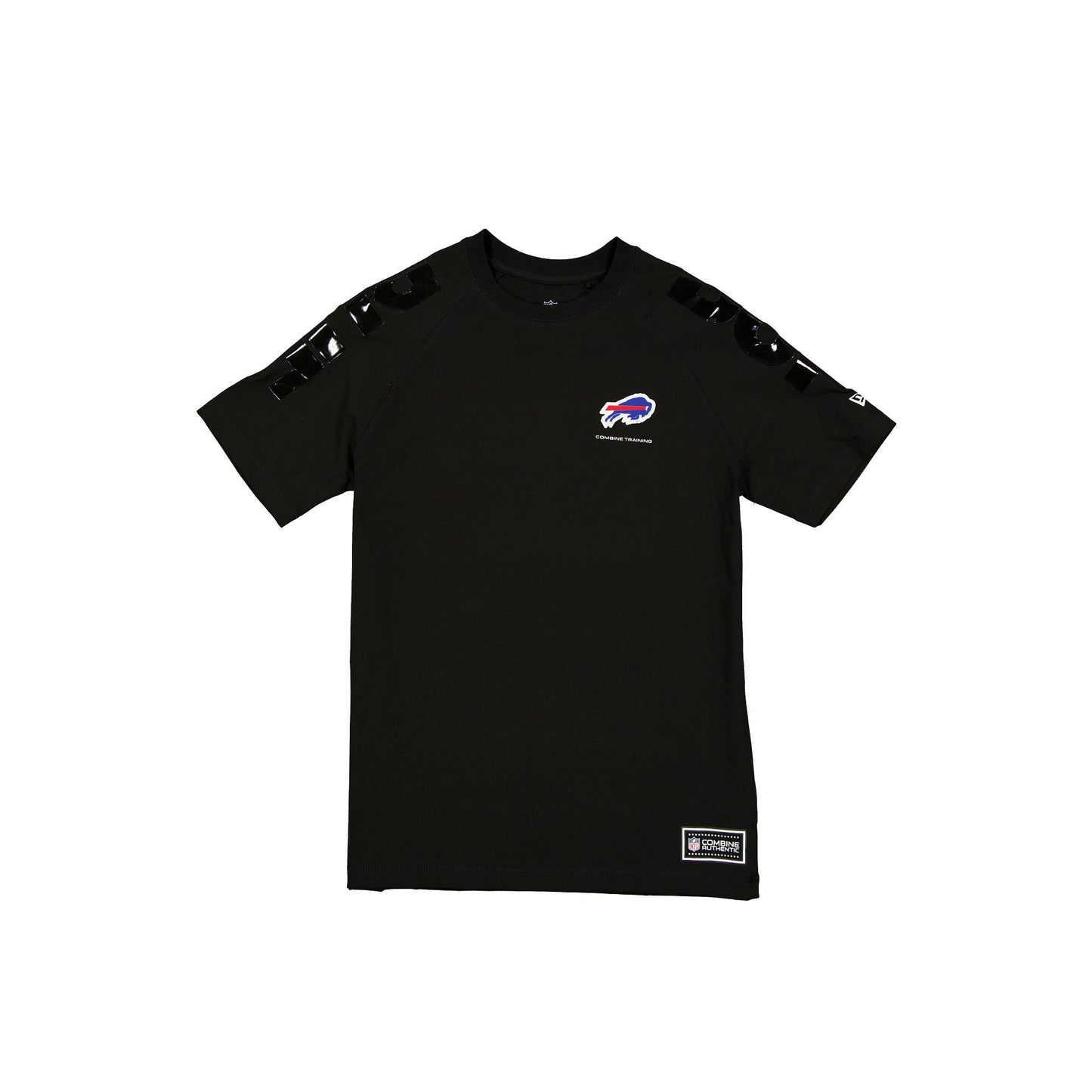 The Buffalo Bills 2025 Functional Fandom Black Short Sleeve T-Shirt features an embroidered silicone Bills logo at the left chest with an Official NFL Combine Authentic patch at the left hip. Additional details include a clear gel ink team wordmark at the shoulders. The shirt has moisture-wicking and antimicrobial fabric with UV protection.