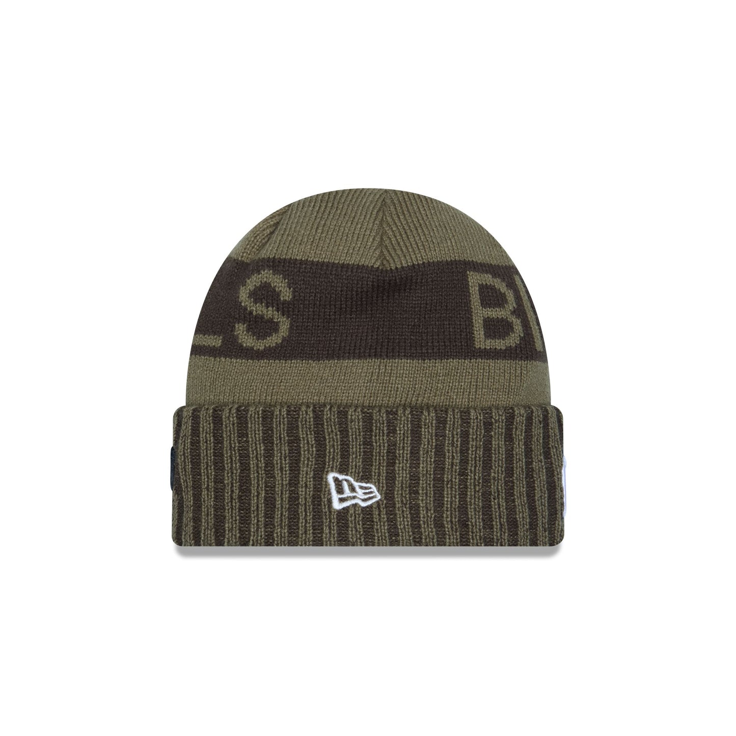 The Buffalo Bills 2025 Salute to Service Cuff Knit features an embroidered Bills logo at the front with a team wordmark at the crown, an American flag patch at the right-wear side, and the official NFL Salute to Service patch at the rear.