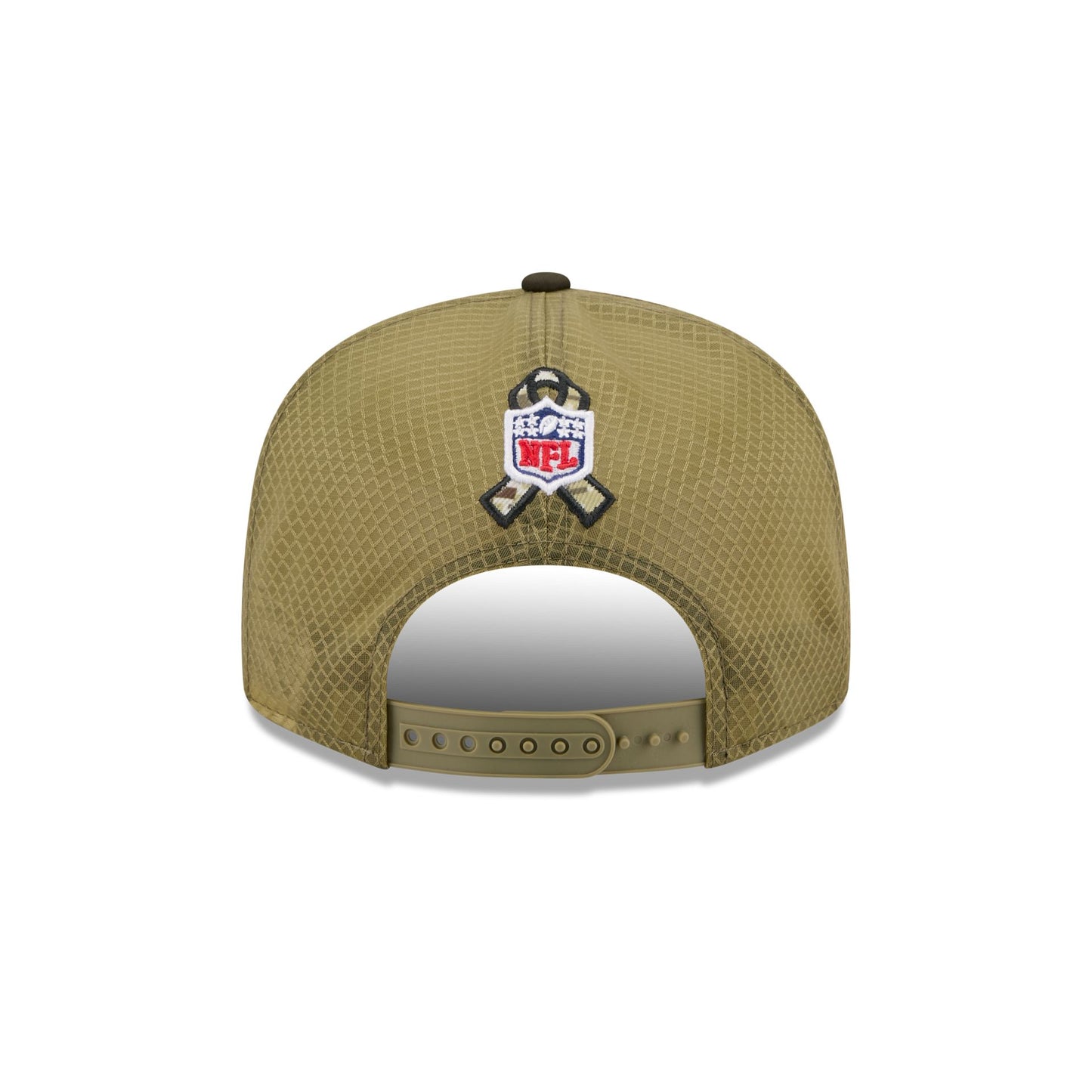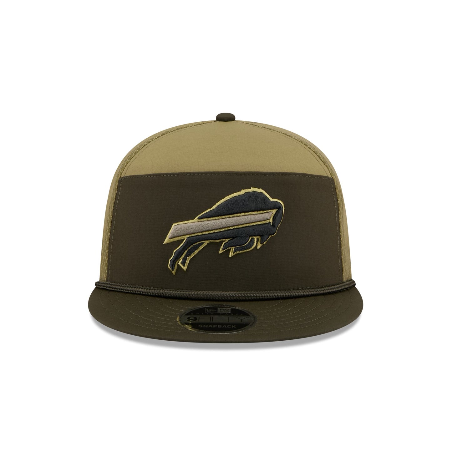 The Buffalo Bills 2025 Salute to Service Split Panel 9FIFTY Trucker features an embroidered Bills logo at the front panels with the official NFL Salute to Service patch above a snapback closure at the rear. Additional details include an American flag patch at the right-wear side with a silicone team logo patch at a dark green undervisor and a digi camo interior fabrication.